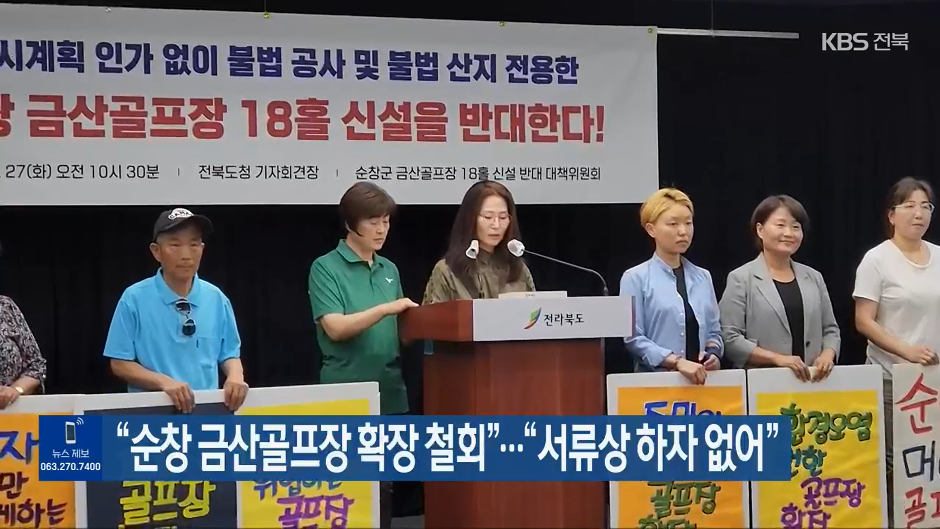 6월 27일 <순창 금산골프장 18홀 확장 반대 대책위원회>는 골프장이 행정 승인 없이 공사를 착수하고 뒤늦게 허가 절차를 진행한 불법 공사 의혹이 있다며 전북도청에서 수사를 촉구하는 기자회견을 진행했습니다.