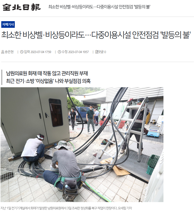 [전북일보] 한전, 남원의료원 화재 정전 긴급복구(7/2, 이종호)