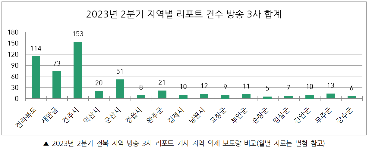 2023년 2분기(4월~6월) 동안 전북 지역 방송 3사가 보도한 지역 의제 리포트 기사 건수는 총 523건으로 나타났다. 2023년 2분기 동안 가장 많이 보도된 지역은 전주시로 총 153건 보도됐다. 가장 적게 보도된 지역은 순창군으로 5건 보도됐다.
