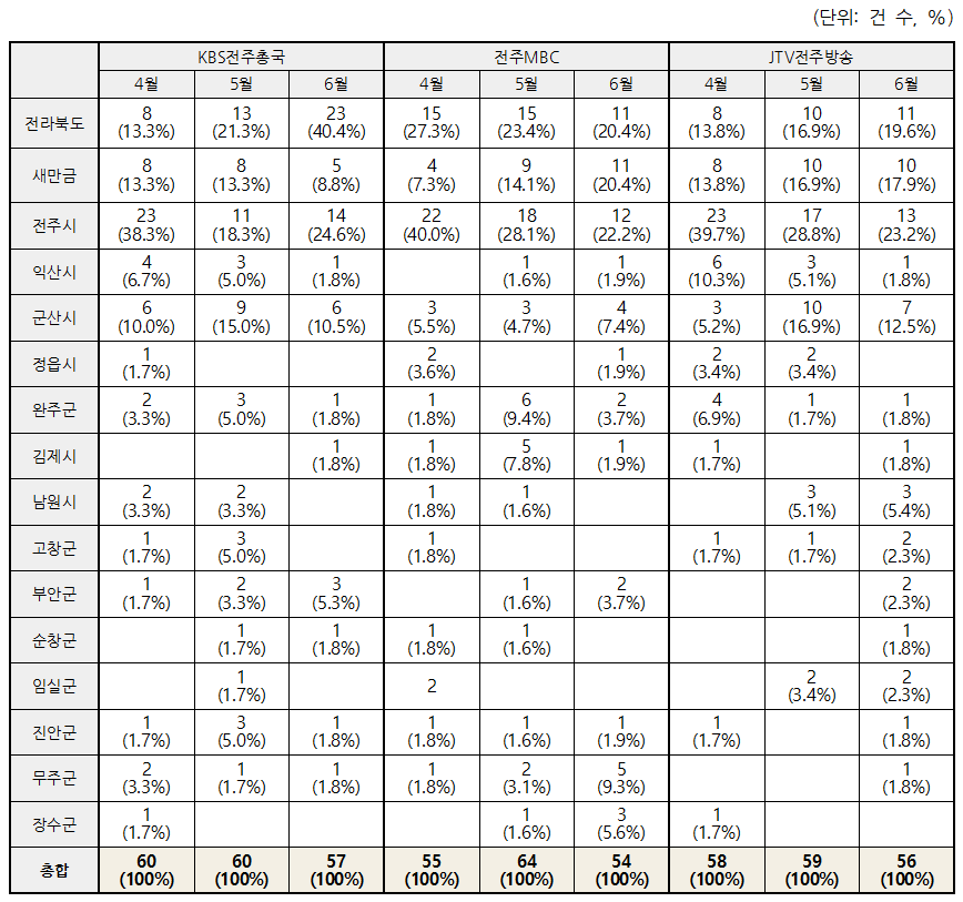 KBS전주총국은 전주시 리포트 기사를 48건(27.1%)으로 가장 많이 보도했고 정읍시, 김제시, 임실군, 장수군 리포트 기사를 각 1건씩(0.5%)으로 가장 적게 보도했다. 전주MBC는 전주시 리포트 기사를 52건(30.1%)으로 가장 많이 보도했고, 고창군 리포트 기사를 1건으로 가장 적게 보도했다. JTV전주방송은 전주시 리포트 기사를 53건(30.6%)으로 가장 많이 보도했고 순창군, 무주군, 장수군 리포트 기사를 각 1건씩(0.6%) 가장 적게 보도했다.