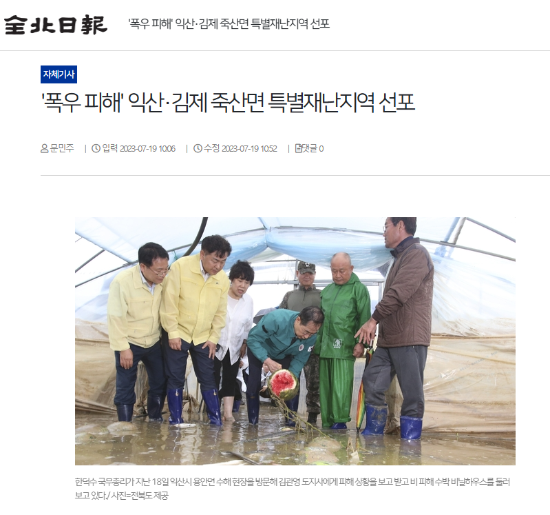 [전북일보] '폭우 피해' 익산·김제 죽산면 특별재난지역 선포(7/19, 문민주)