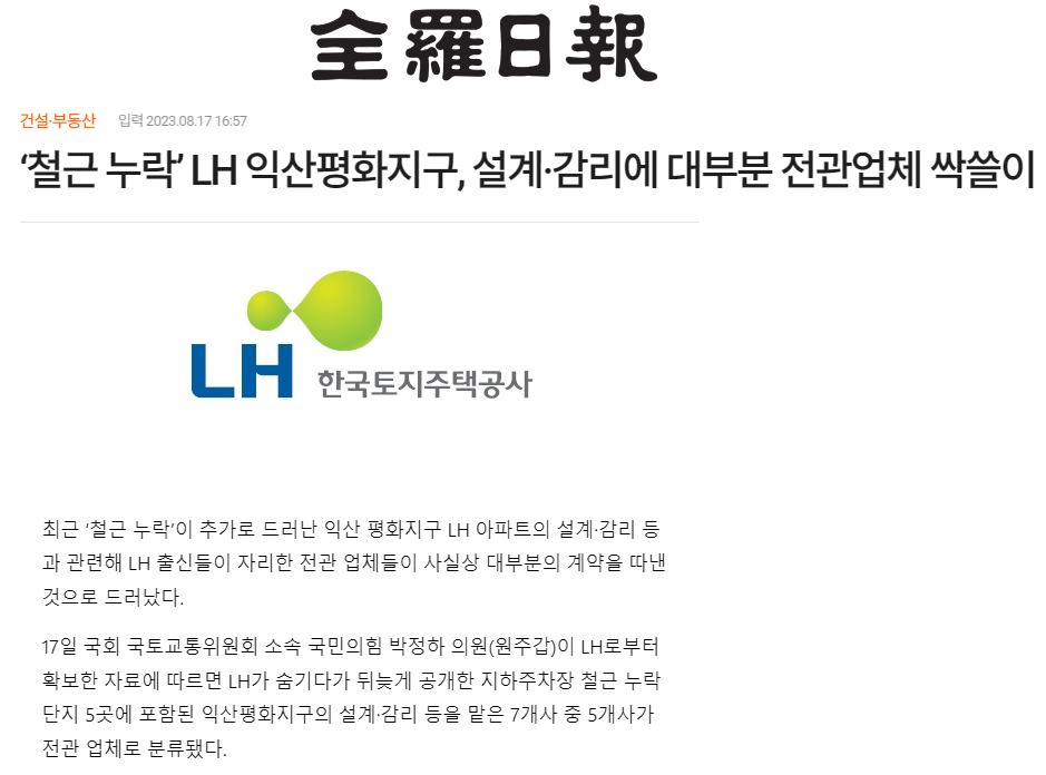보강공사를 해 안전에 문제가 없다지만 애초에 왜 철근이 빠진 사실이 뒤늦게 드러났을까요? 오늘 자 전라일보는 “17일 국민의힘 박정하 의원이 LH로부터 확보한 자료에 따르면 LH가 뒤늦게 공개한 철근 누락 단지 5곳에 포함된 익산 평화지구의 설계‧감리 등을 맡은 7개사 중 5개사가 전관 업체로 분류됐다.”라고 보도했습니다.