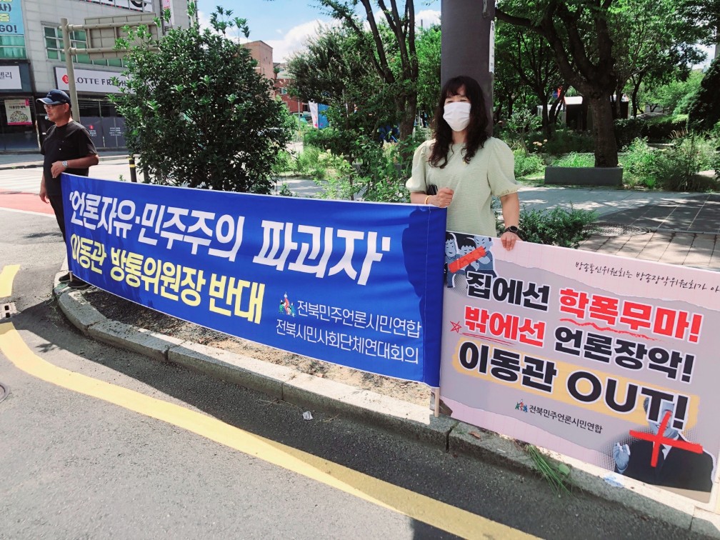전북민주언론시민연합(전북민언련)과 전국언론노동조합전북협의회(언론노조전북협의회), 전북시민사회단체는 8월 한달 동안 매주 금요일 ‘이동관 방송통신위원장 사퇴 촉구’ 시위를 진행하