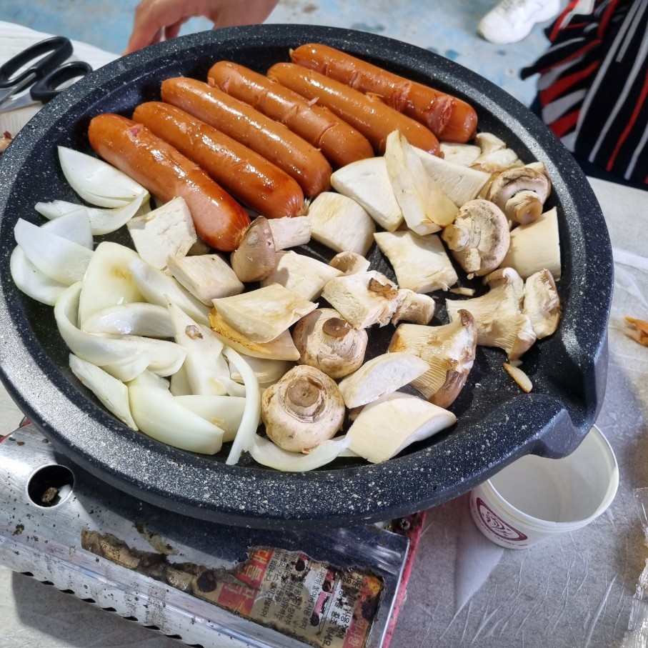 회원님들과 함께 바베큐 그릴 준비 중입니다.
