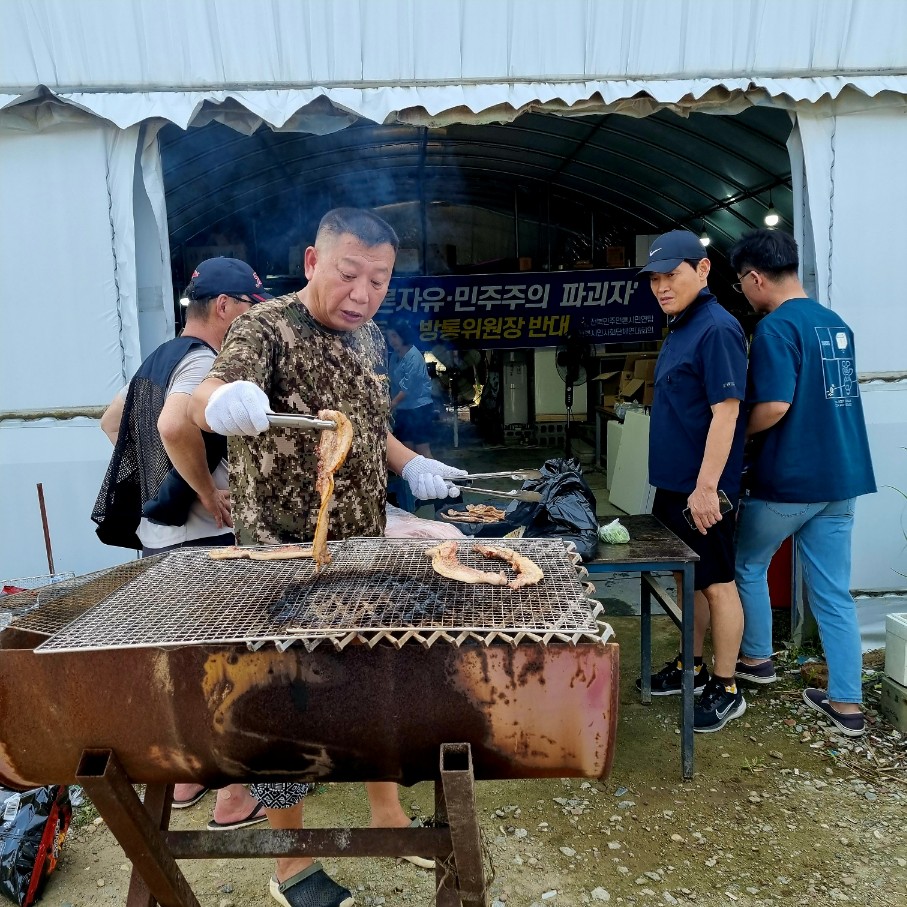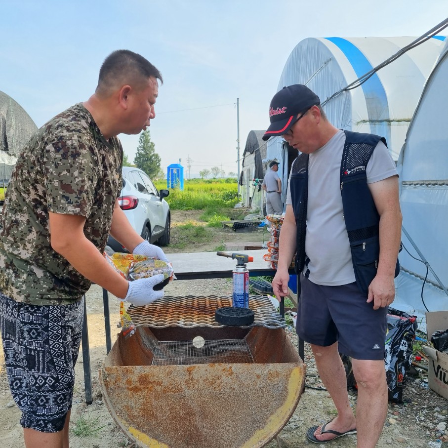 회원님들과 함께 바베큐 그릴 준비 중입니다.
