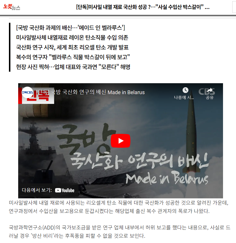 1. [노컷뉴스전북] [단독]미사일 내열 재료 국산화 성공 ?…"사실 수입산 박스갈이" 폭로 파문(8/1, 남승현, 김대한)