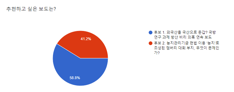 두 개의 후보 중 <외국산을 국산으로 둔갑? 국방 연구 과제 방산 비리 의혹 연속 보도> 노컷뉴스 보도가 58.8%의 투표를 받아 2023년 08월의 좋은 기사로 선정되었습니다. 축하드립니다.