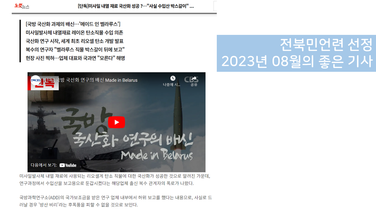 1. [노컷뉴스전북] [단독]미사일 내열 재료 국산화 성공 ?…"사실 수입산 박스갈이" 폭로 파문(8/1, 남승현, 김대한)
