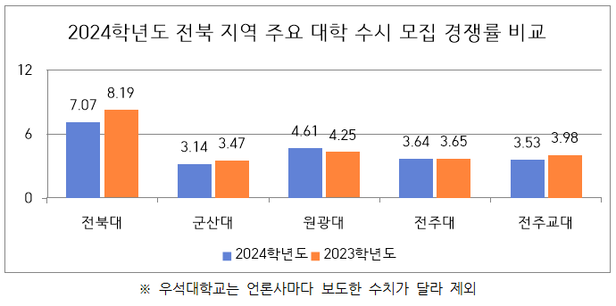 반면 전라일보, KBS전주총국, JTV전주방송은 정원외 모집(1,634명 모집, 7,216명 지원)까지 포함해 4.42대 1의 경쟁률을 보여 지난해 4.10대 1보다 상승했다고 보도했습니다.