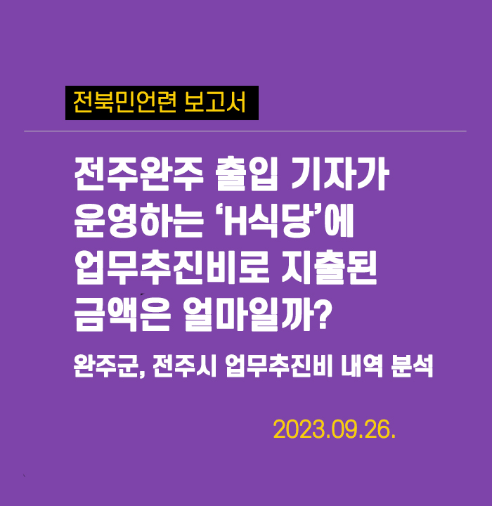 이러한 경향은 완주군뿐만이 아니다. 해당 기자는 완주군뿐 아니라 전주시도 오랜 시간 출입해 왔고 전주시에서도 H식당 관련해 유사한 경향을 보이는 문제를 드러냈다. 전주시의 2022년~2023년 홈페이지에 9월 25일 기준으로 현재까지 공개된 시장, 부시장, 국장급, 시의회 업무추진비를 살펴본 결과 10,843,400원이 H식당에 사용된 것으로 확인 된다.