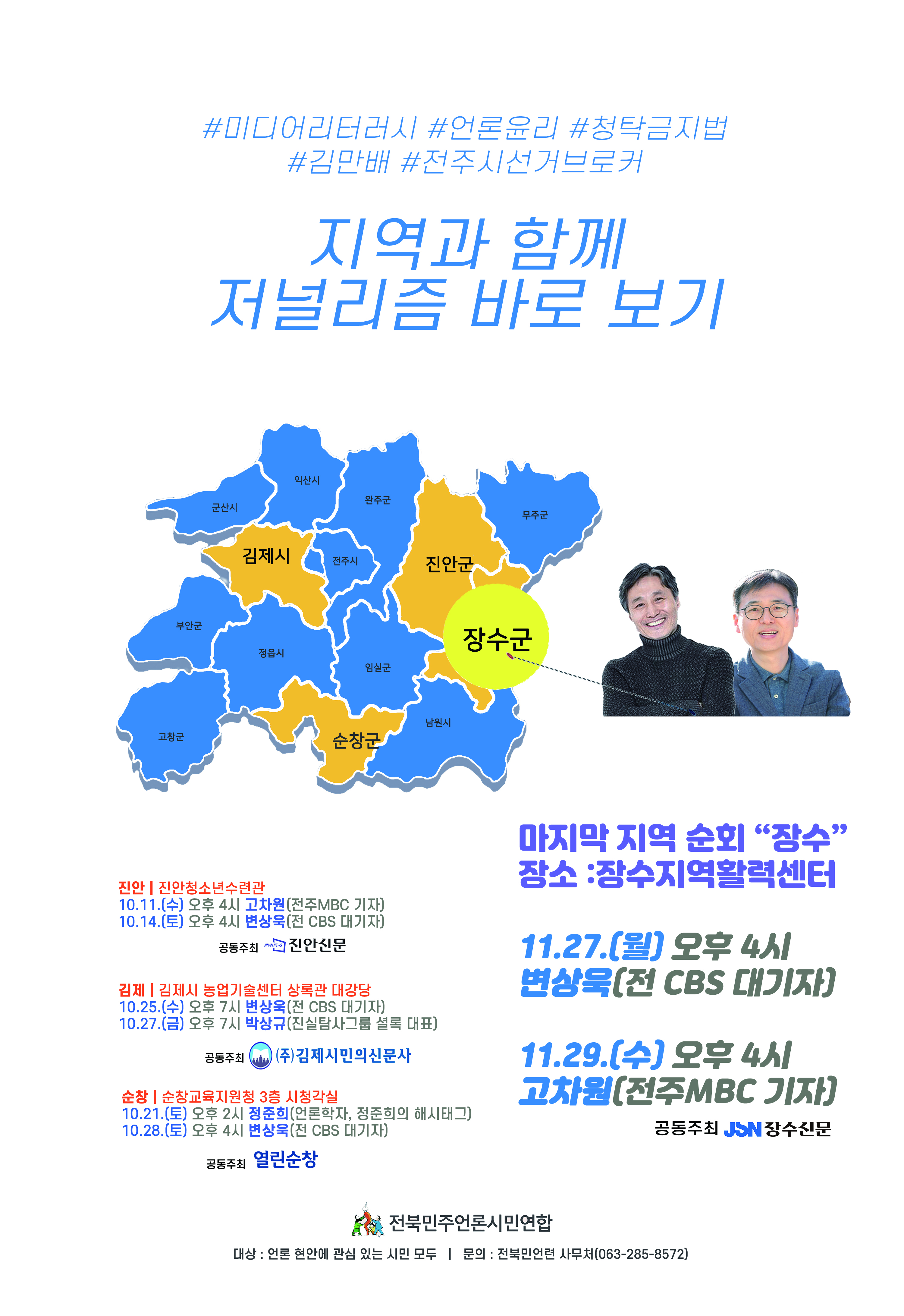 전북민언련에서는 2023년 10월 전북 작은 시군의 풀뿌리주간신문과 함께 저널리즘을 바로 보기 위한 미디어 교육을 진행합니다. 작은 언론학교라고 애칭을 붙여봤는데요. 이번 지역과 함께하는 미디어 강좌는, 전주에서 진행된 언론학교를 뜨겁게 채워주셨던 변상욱 기자님, 박상규 대표님, 정준희 교수님이 함께합니다. 또한 전주시 선거브로커 사건을 알린 전주MBC 고차원 기자님도 함께합니다.