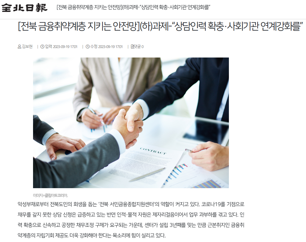 후보 3. 경제적 취약계층 회생 돕는 전북 서민금융종합지원센터 지원 필요성 강조한 보도