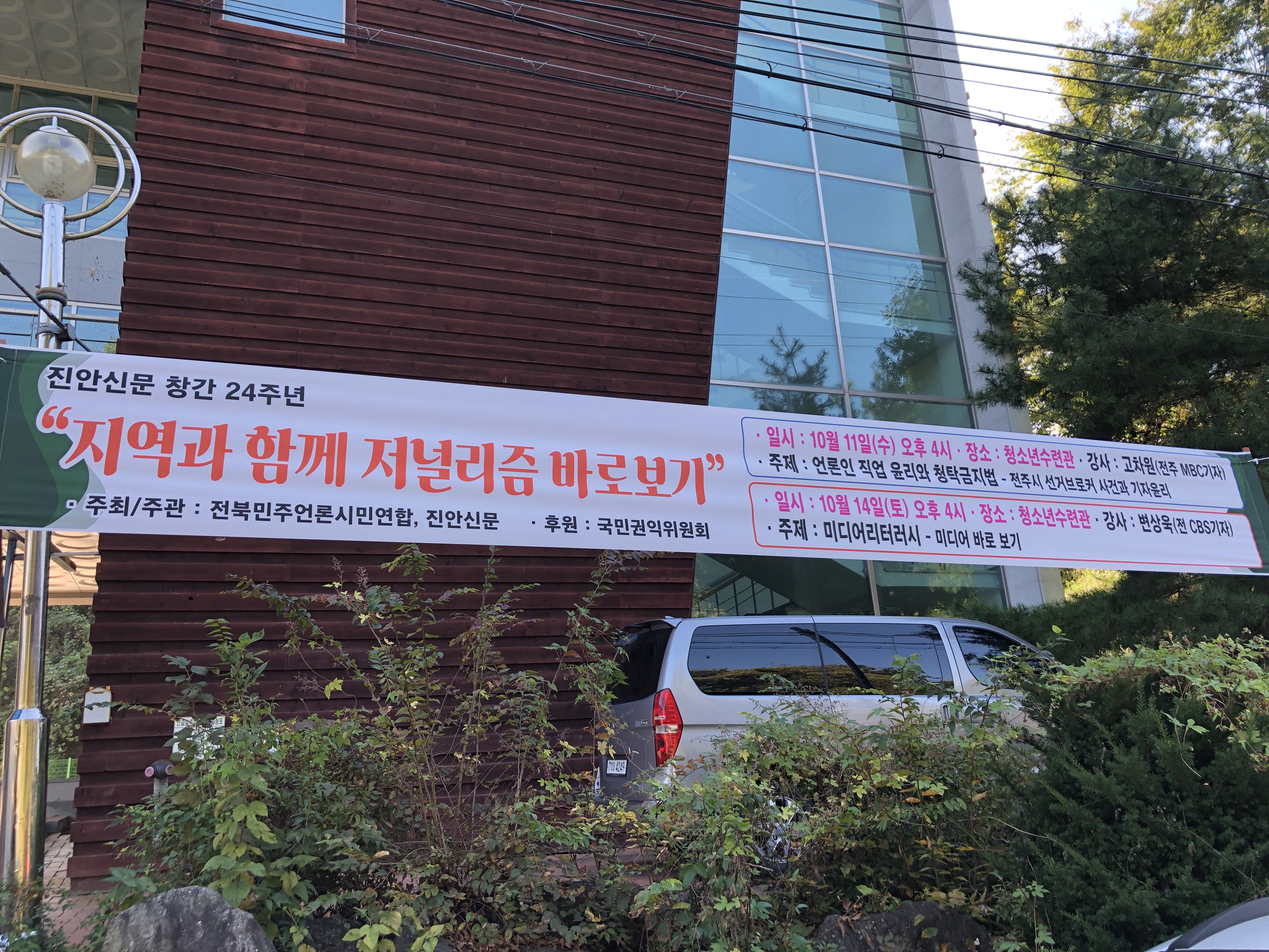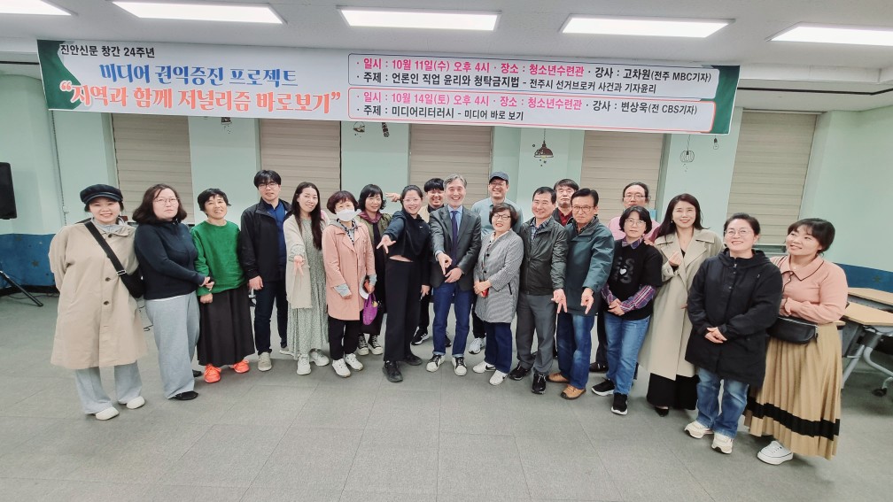 우선 지난 10월 11일(수)와 10월 14일(토) 진안청소년수련관 다목적실에서 진안군민들을 대상으로 한 첫 강의를 진행했습니다. 진안신문과 같이 공동 주최, 주관을 하고 강의를 준비했습니다. 전북민언련에서는 2023년 10월 전북 작은 시군의 풀뿌리주간신문과 함께 저널리즘을 바로 보기 위한 미디어 교육을 진행합니다. 이번 지역과 함께하는 미디어 강좌는 전주에서 진행된 언론학교를 뜨겁게 채워주셨던 변상욱 기자님, 박상규 대표님, 정준희 교수님이 함께합니다. 또한 전주시 선거브로커 사건을 알린 전주MBC 고차원 기자님도 함께합니다. 맛있는 다과도 준비했습니다.