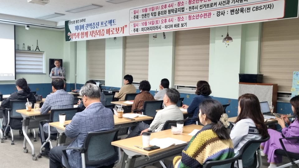 먼저 지난 11일 "선거 브로커와 언론 윤리"라는 주제로 전주MBC 고차원 기자님 강의가 진행되었습니다.