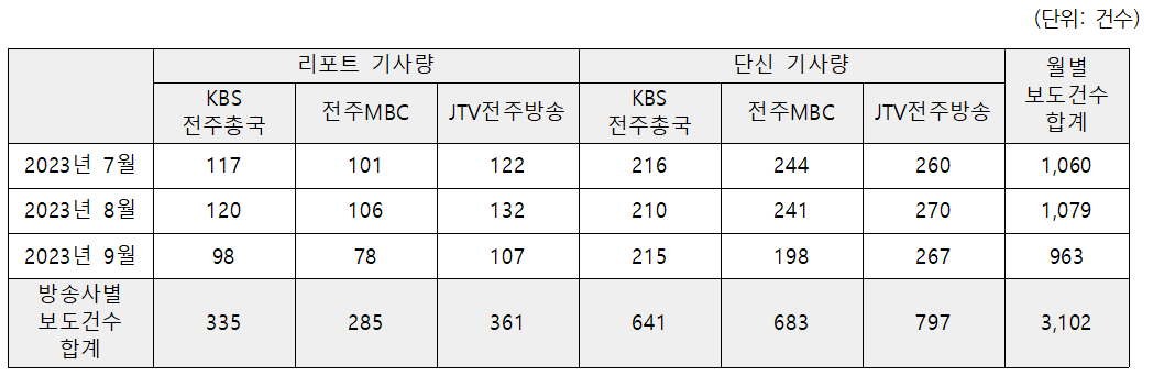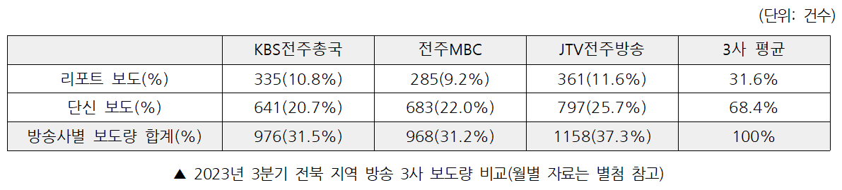 2023년 3분기 동안 전북 지역 방송 3사가 보도한 총 보도 건수는 3102건으로 리포트 981건(31.6%), 단신 2121건(68.4%)으로 나타났다. 리포트 기사와 단신 기사 모두 JTV전주방송이 각각 361건(11.6%), 797건(25.7%)으로 가장 많았다. 반면 가장 적은 리포트 기사 건수는 전주MBC가 285건(9.2%)으로 나타났고, 가장 적은 단신 기사 건수는 KBS전주총국이 641건(20.7%)으로 나타났다.