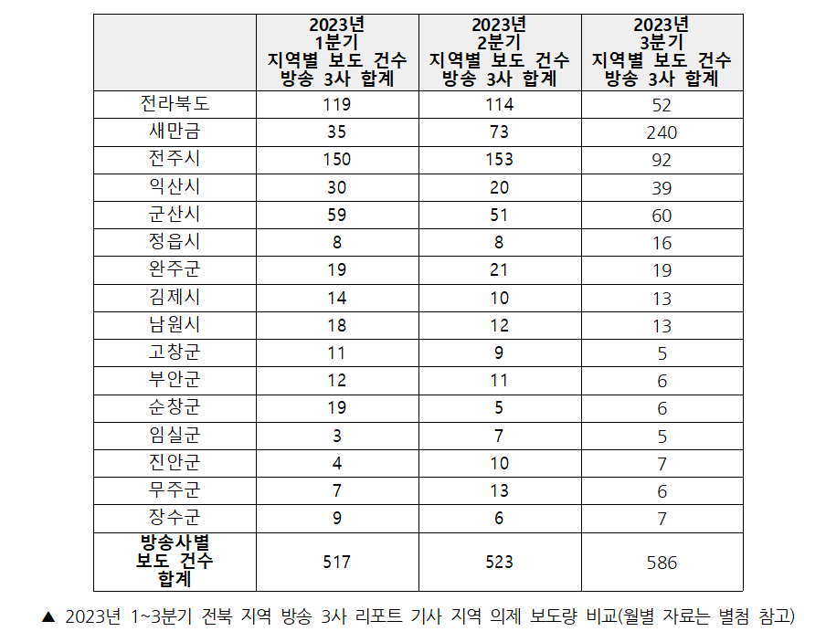 2023년 3분기(7월~9월) 동안 전북 지역 방송 3사가 보도한 지역 의제 리포트 기사 건수는 총 586건으로 나타났다. 2023년 3분기 동안 가장 많이 보도된 지역은 새만금으로 총 240건 보도됐다. 가장 적게 보도된 지역은 고창군과 임실군으로 5건씩 보도됐다.