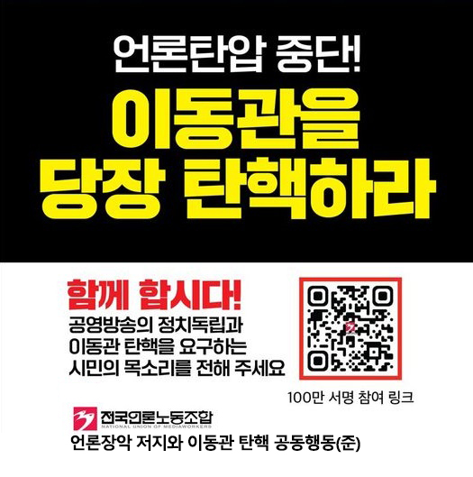 방송장악 분쇄! 언론탄압 저지를 위한 "방송법 수용! 이동관 탄핵!" 백만인 서명 운동에 동참해 주십시오.