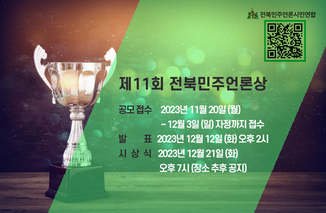 전북민주언론시민연합(공동대표 김은규, 이상훈, 이종규)은 지역 언론의 발전방향을 모색하고 바른 언론의 상을 정립하기 위하여 지역 방송과 신문, 풀뿌리 언론, 그리고 인물과 단체를 대상으로 「제11회 전북민주언론상」을 추천받습니다.