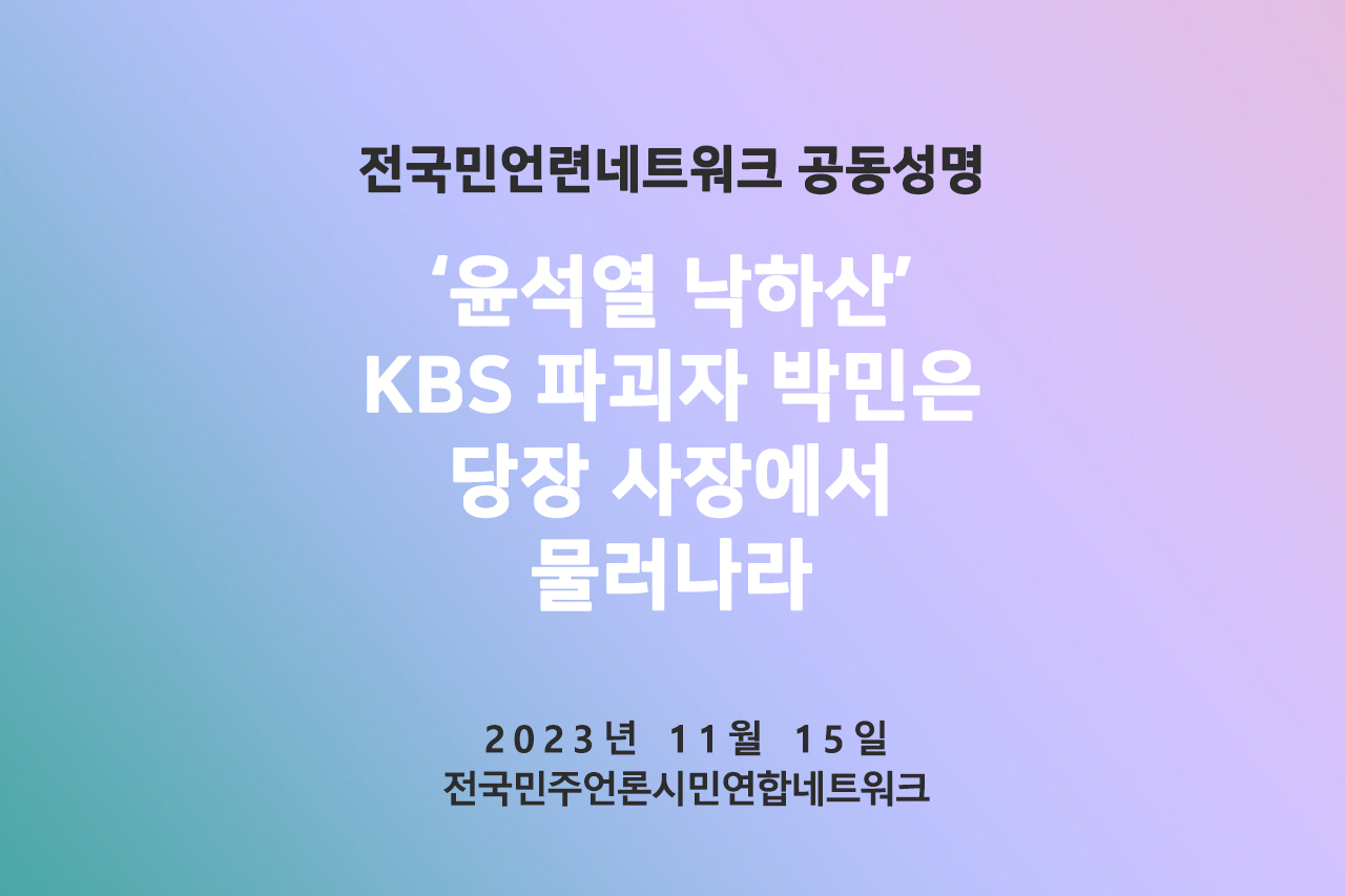 사장이라 부르기도 부끄러운 KBS 점령군 박민은 당장 그 자리에서 물러나라. KBS 장악을 위해 그 자리를 악용한다면 부당한 공영방송 탄압에 책임을 물어 이동관 방송통신위원장 탄핵운동이 전국으로 번지고 있듯 국민들의 거센 퇴진운동에 직면할 것이다. 전국민주언론시민연합네트워크는 시민들과 함께 공영방송의 정치적 독립과 언론자유를 지키기 위해 ‘박민 퇴진’ 투쟁을 끝까지 벌일 것이다.