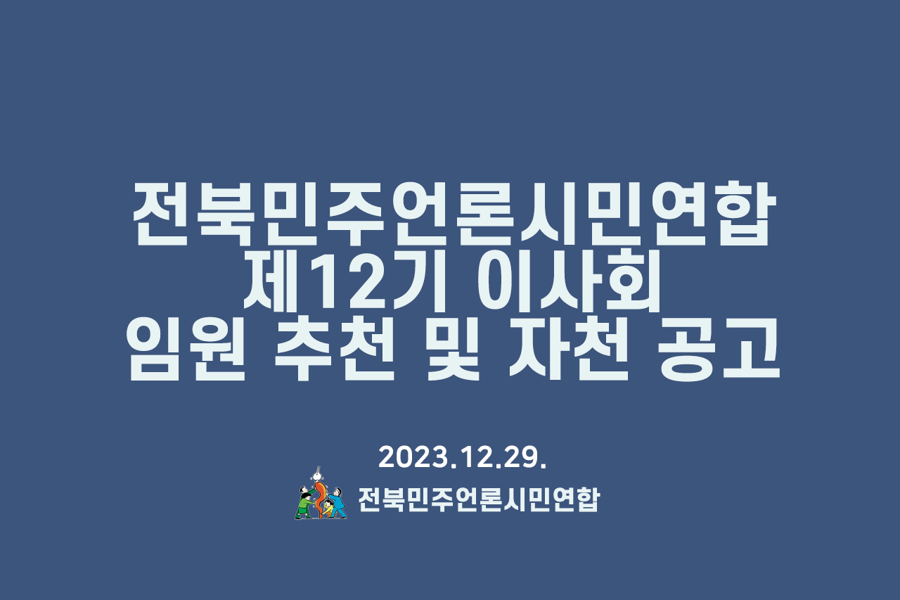 전북민주언론시민연합은 회원의 의사결정기구 참여를 활성화하기 위해 지속적으로 노력하고 있습니다. 그 일환으로 의사결정기구의 회원 대표성을 강화하기 위해 회원 중에서 임원과 이사, 감사를 추천받고 있으며 자천도 가능합니다. 마련된 절차에 따라 총회에서 선출하고 있으니 전북민언련 회원님들의 많은 관심과 참여 부탁드립니다.