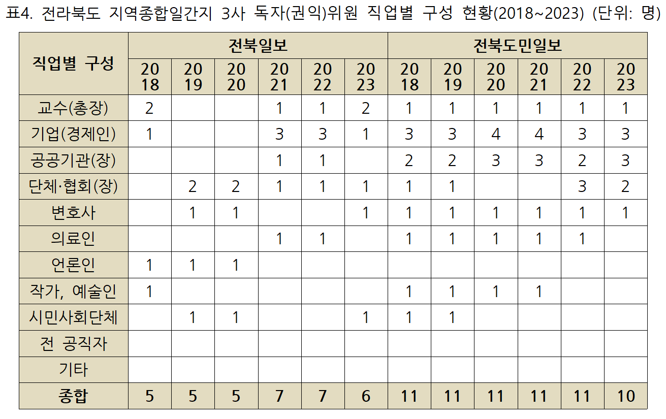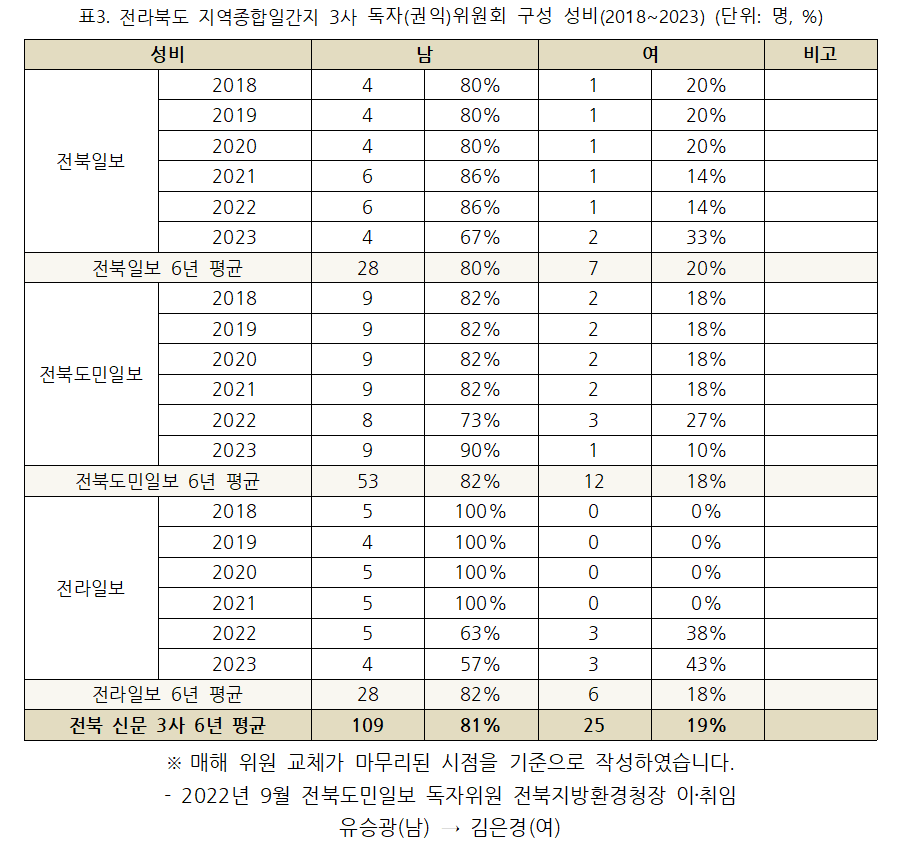 2018년부터 2023년까지 전라북도 지역 종합일간지 3사의 독자(권익)위원회의 6년 평균 성비 구성은 남성 81%(109명), 여성 19%(25명)로 여전히 남성 위원의 비율이 매우 높았으나 최근 2년 동안 눈에 띄는 변화가 있었다.