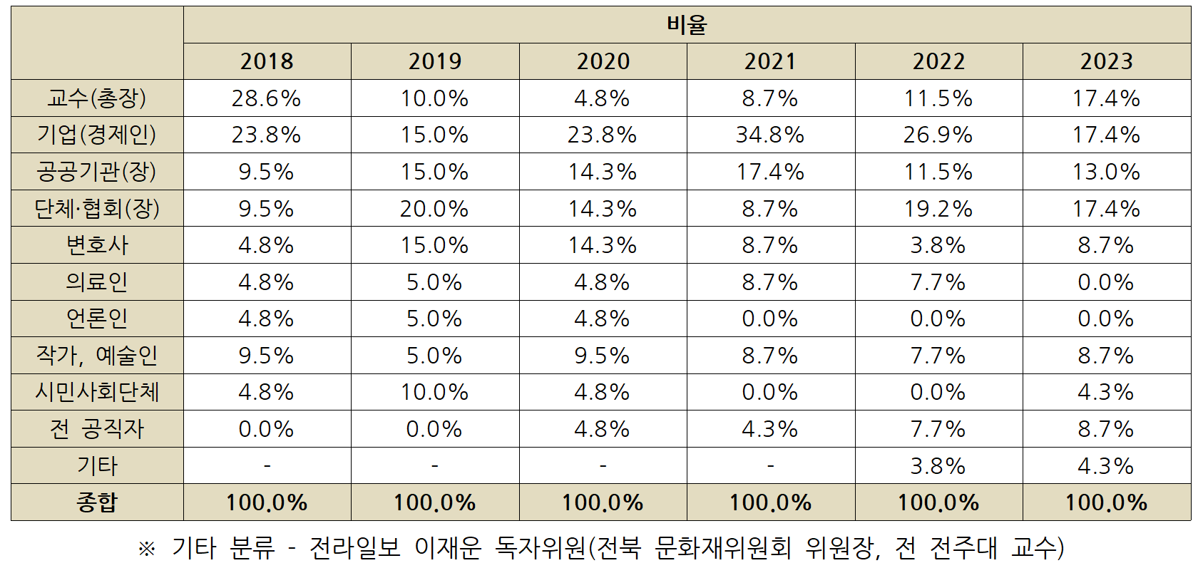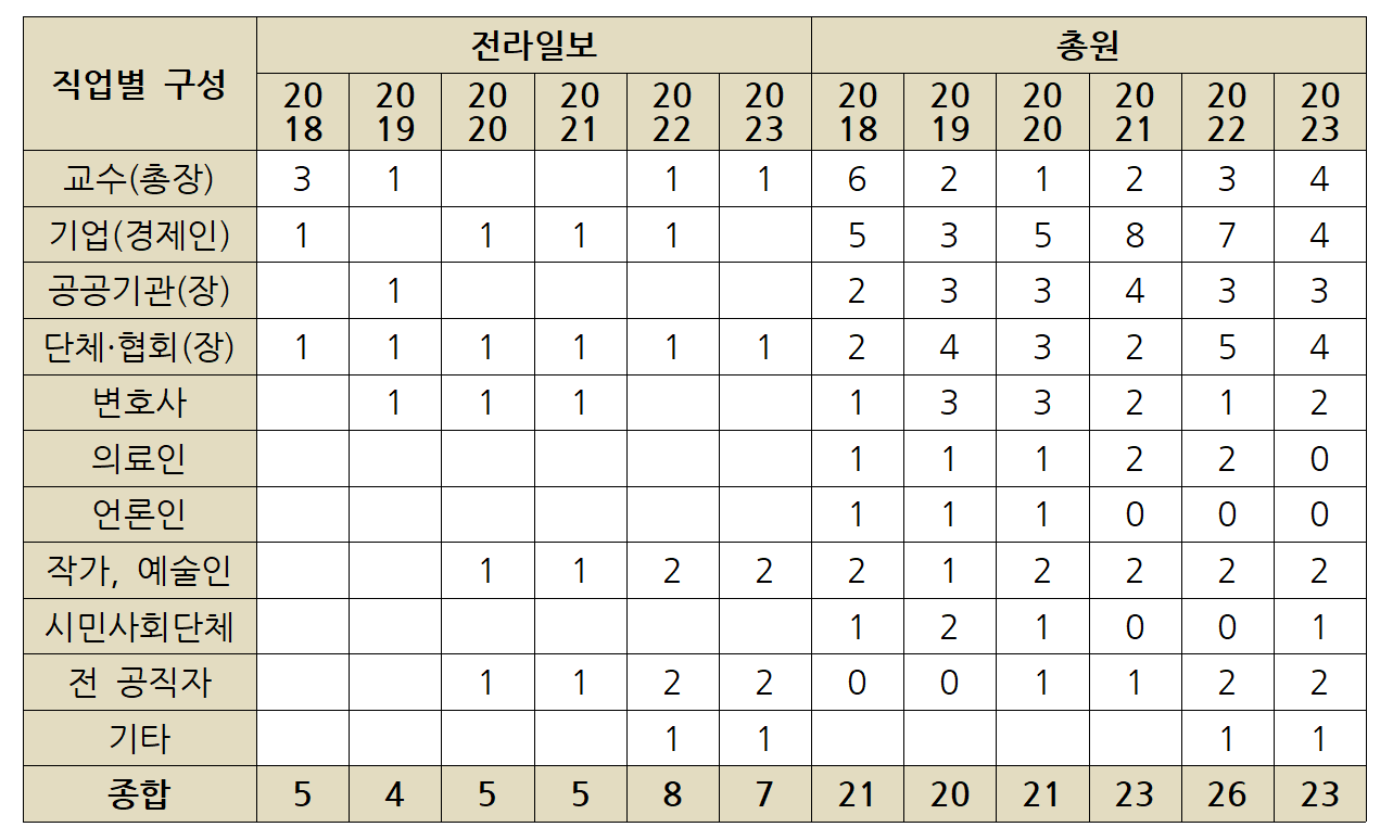 신문사 독자(권익)위원회 위원의 다수가 여전히 교수, 기업인, 공공기관장, 단체협회장 중심으로 구성되어 있으며, 2023년 기준 네 직업군의 비율이 65.2%로 절반 이상을 차지하고 있다. 다만 세부적으로 살펴보면 각 직업군마다 조금씩 비율의 변화가 보인다.