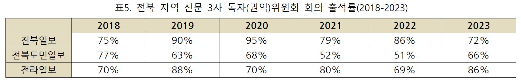5) 전북 지역 신문 3사 독자(권익)위원회 연도별 평균 출석률