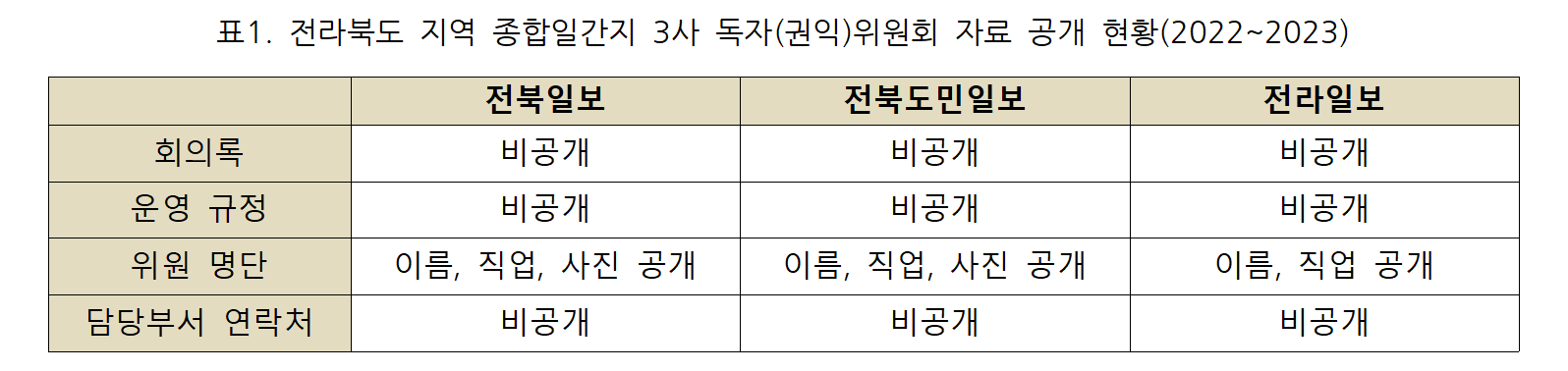 신문사별로 살펴보면 전북일보는 2022년까지 여성 위원이 1명이었으나 2023년에는 여성 위원이 2명이 되었고, 남성 위원 수를 줄이는 등의 변화를 보였다.