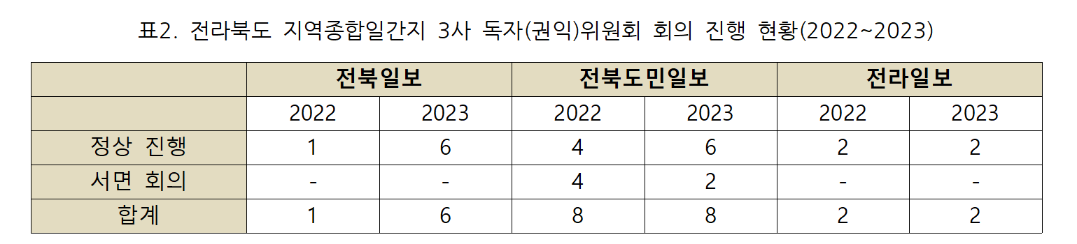 전북일보의 경우 2020년은 분기별로 총 4회, 2021년은 상‧하반기로 나눠 2회 진행했으나 2022년은 단 1회만 진행하였는데, 코로나19 확산의 영향으로 정상적인 회의를 진행하기 어려웠던 것으로 보인다. 대신 2023년에는 회의 횟수를 2개월에 한 번씩 총 6회로 횟수를 늘려 진행하였다.