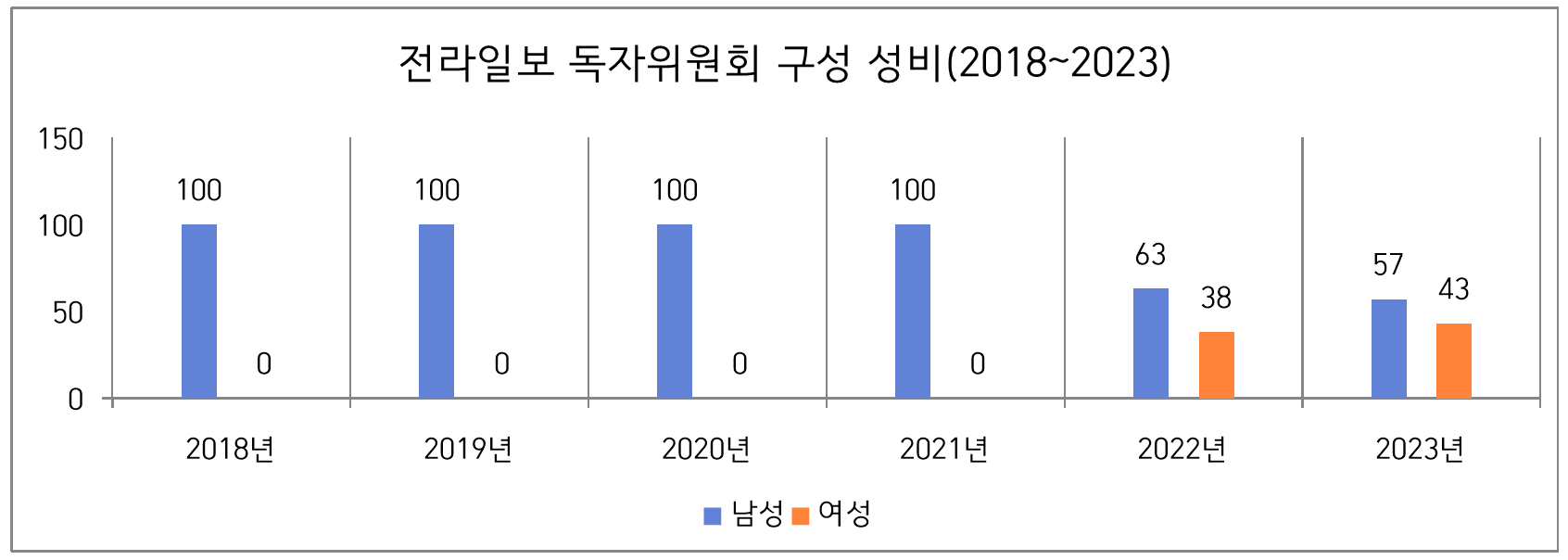 전라일보는 가장 큰 변화를 보였다. 2021년까지는 여성 위원이 없었지만 2022년 여성 위원 3명을 포함한 위원들을 추가로 위촉해 독자위원회를 운영하였다. 결과적으로 2023년 기준 세 신문사 중 여성 위원의 비율이 가장 높아졌다.