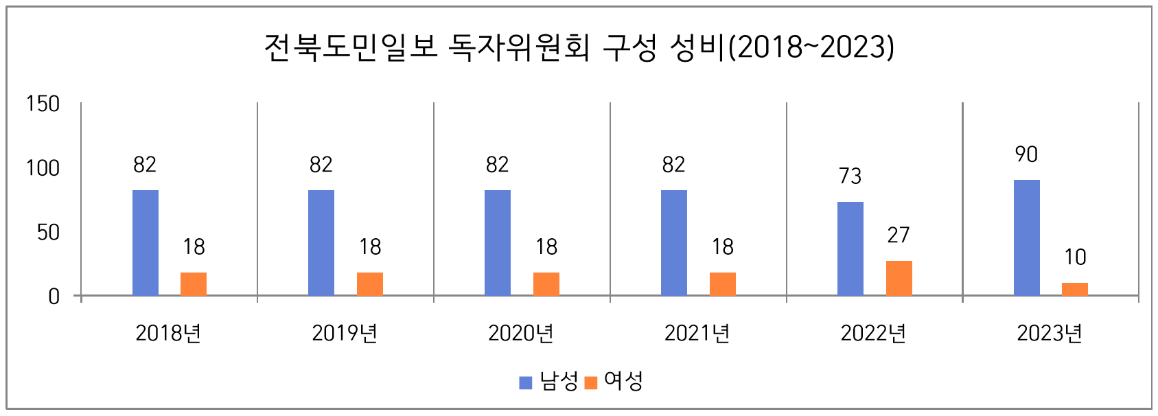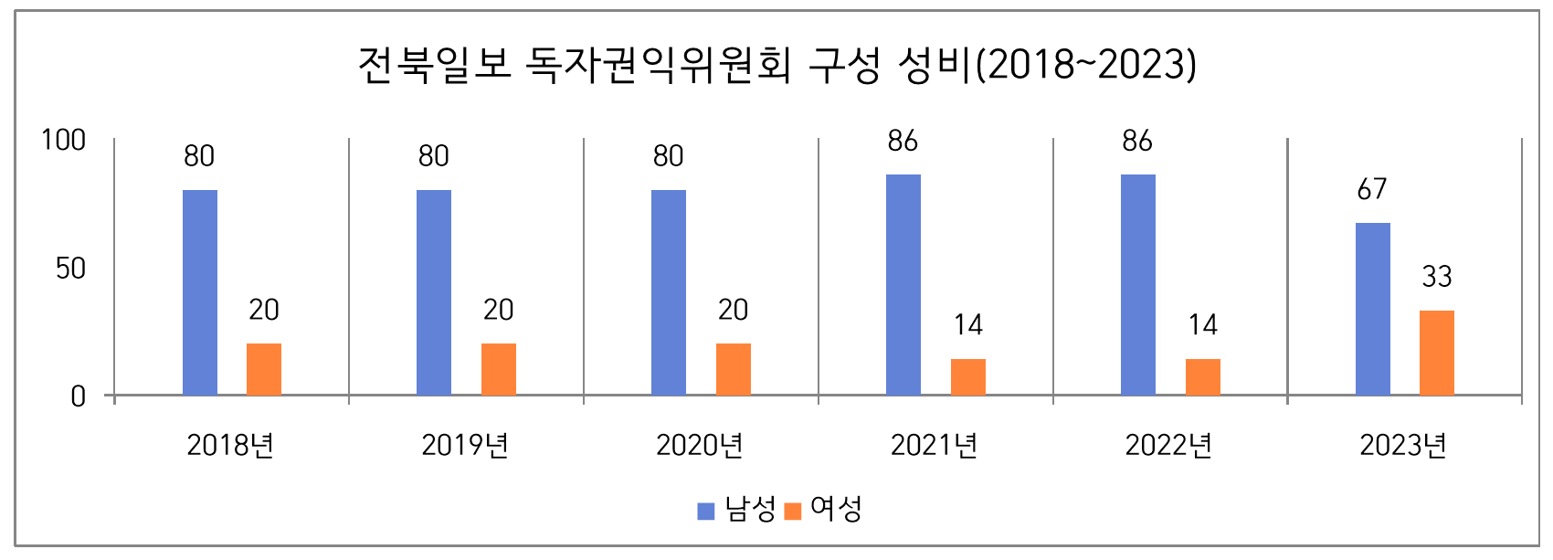 신문사별로 살펴보면 전북일보는 2022년까지 여성 위원이 1명이었으나 2023년에는 여성 위원이 2명이 되었고, 남성 위원 수를 줄이는 등의 변화를 보였다.