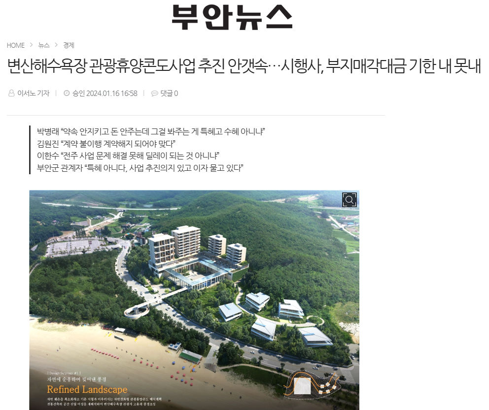 [부안뉴스] 변산해수욕장 관광휴양콘도사업 추진 안갯속…시행사, 부지매각대금 기한 내 못내(1/16, 이서노)