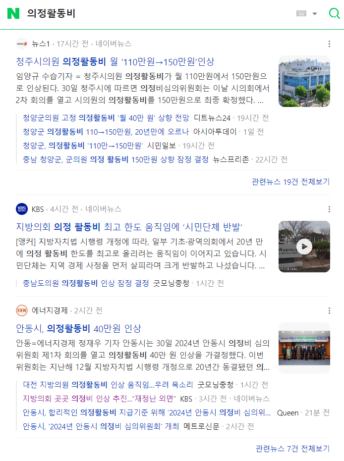 지방의회의 의정활동비 인상 추진은 어느 특정 지역이 아니라 전국에서 일어나고 있는데요, 포털사이트에서 ‘의정활동비’로 뉴스 검색을 하면 곳곳에서 의정활동비 인상을 추진하고 있고 이에 대한 비판이 이어지고 있다는 보도를 쉽게 찾아볼 수 있습니다.