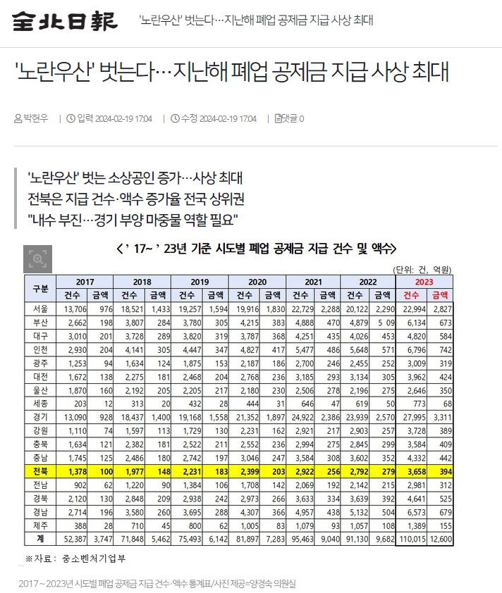 양경숙 의원실에서 제공하고 오늘 자 전북일보가 홈페이지에 보도한 <2017년 ~ 2023년 기준 시도별 폐업 공제금 지급 건수 및 액수> 표를 보면, 코로나19 확산이 본격적으로 시작된 2021년 공제 건수와 액수가 2020년과 비교해 크게 증가한 것을 확인할 수 있는데 코로나19 여파가 현재까지 계속 남아있는 것으로 보입니다.