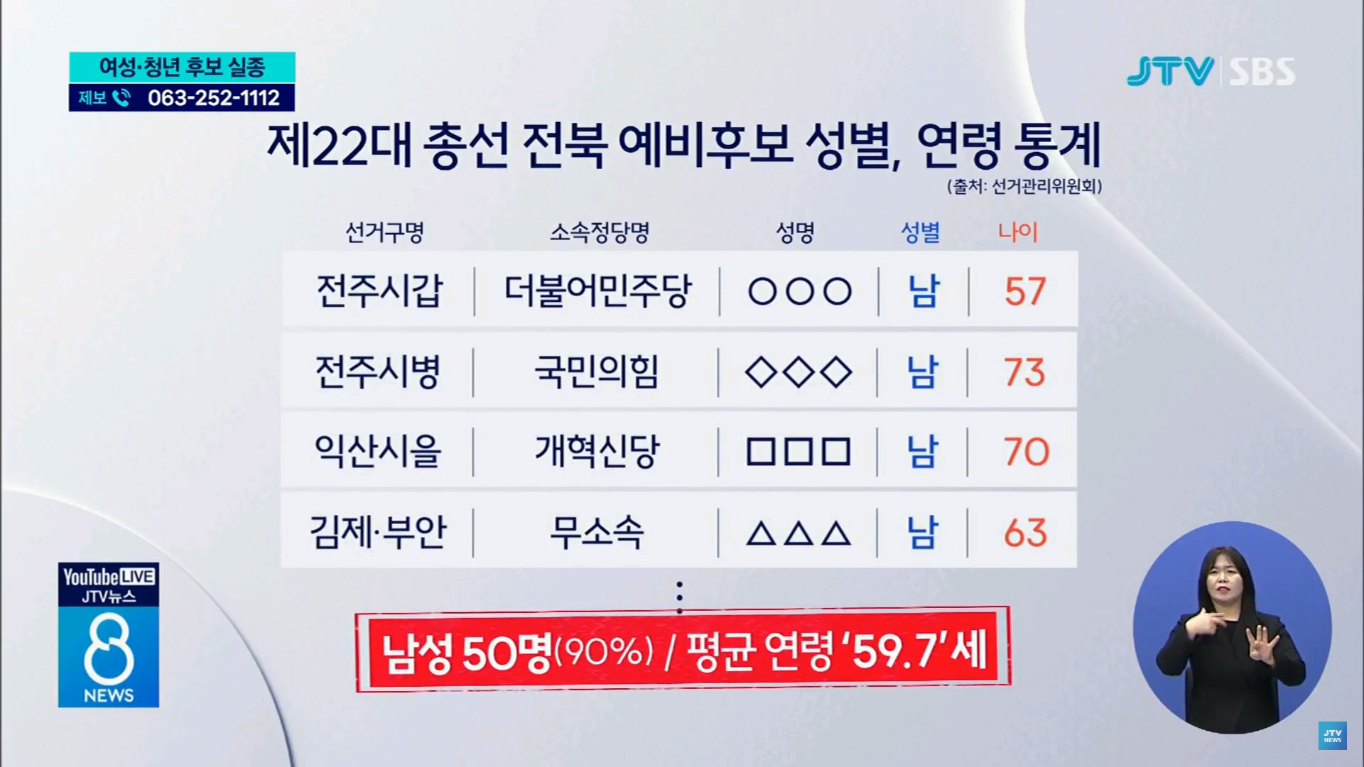 JTV전주방송은 제22대 총선 전북 예비후보 성별, 연령 통계를 분석한 결과 남성 90%(50명), 평균 연령은 59.7세로 나타났다며 “4년 전 21대 총선에서 전북의 당선자 10명은 모두 남성에 평균 연령은 55.1세였다. 이번 총선 전북에서 예비후보로 등록한 55명 가운데 여성은 5명이었다. 청년 후보도 마찬가지다. 전체 55명 가운데 두 명뿐이다. 그나마 고종윤 후보는 당초 경선 참여조차 배제됐다가 하루 만에 포함되고 결국 고배를 마셨다.”라고 보도했습니다.