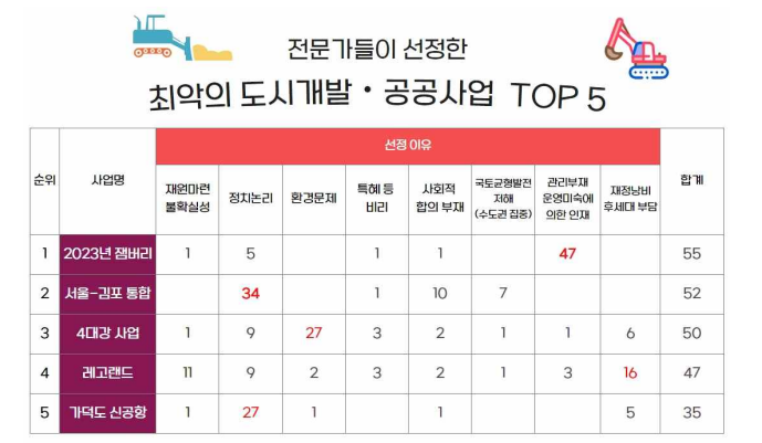 한편 최악의 공공사업 2위는 서울-김포 통합 계획, 3위는 4대강 사업, 4위는 레고랜드, 5위는 가덕도 신공항이었습니다.