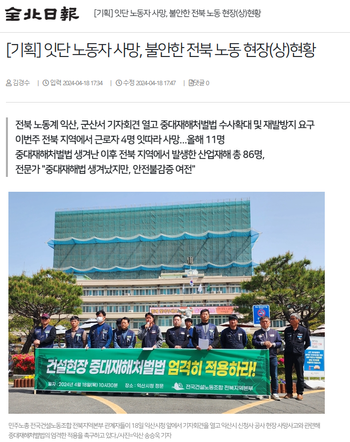 #연이은 전북 지역 노동자 사망사고, 4월에만 6명 사망