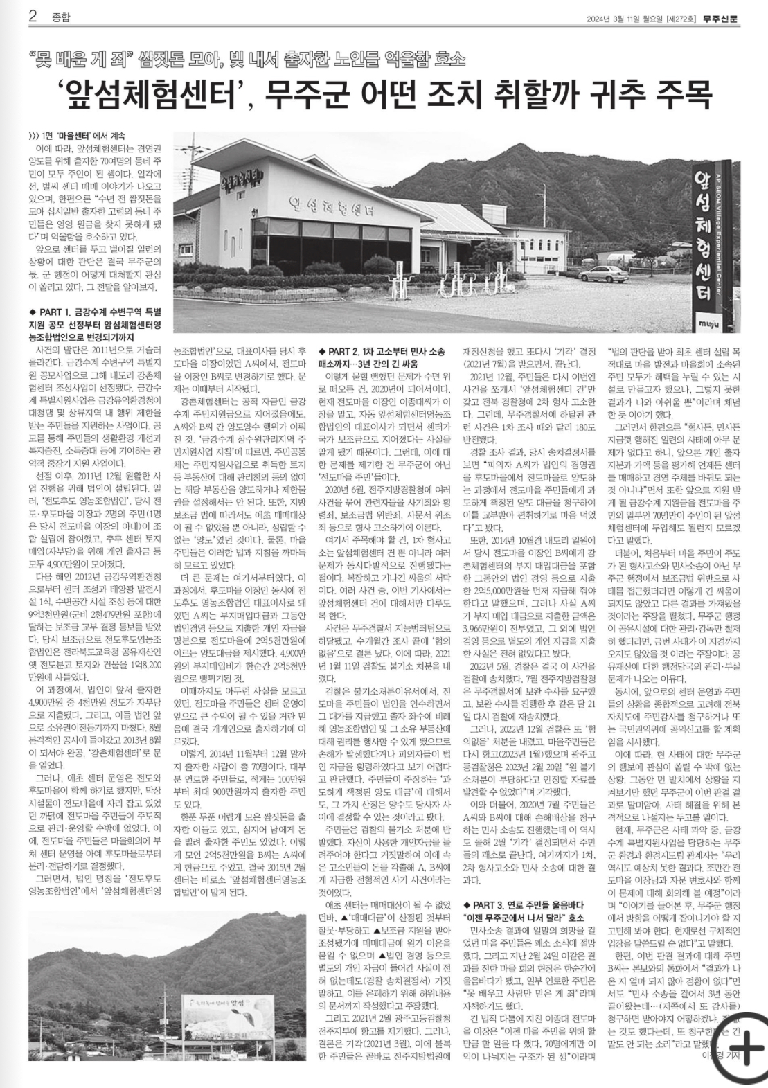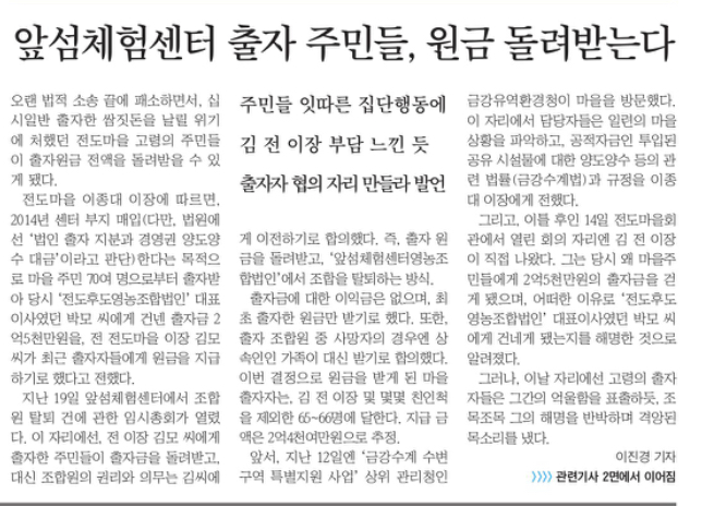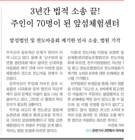 1. 3년간 법적 소송 끝주인이 70명이 된 앞섬체험센터(3/11, 1면, 2면이진경 취재기자)