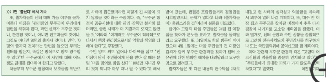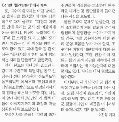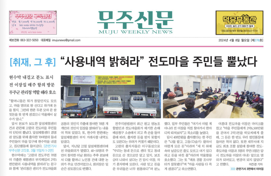 4월 29일 무주신문은 이후 전 이장 측이 부담을 느낀 것 같다며 주민들이 출자금 원금을 돌려받을 것이라고 보도했는데요. 주민들이 돈을 돌려받아도 센터 운영권을 소수가 가지게 되며 생기는 문제점을 전달하고, 마을 공유재산에 대한 운영 책임과 수익 배분, 공적 자금 계속 투입이 가능할지는 의문이라고 보도했습니다.
