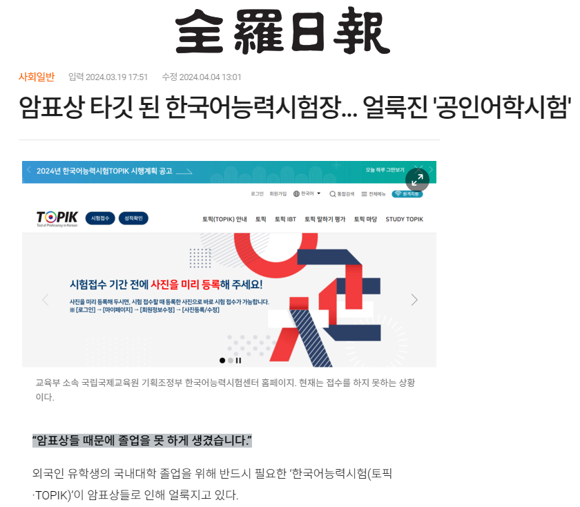 전라일보는 외국인 유학생들의 하소연을 전달하고, 중국 SNS 등을 통해 암표 거래가 실제로 이루어지는 과정을 취재했는데요. 이후 이메일 인증 절차가 허술한 시험 접수 시스템의 문제와 시험을 담당하고 있는 국립국제교육원의 무책임한 태도를 비판했습니다.