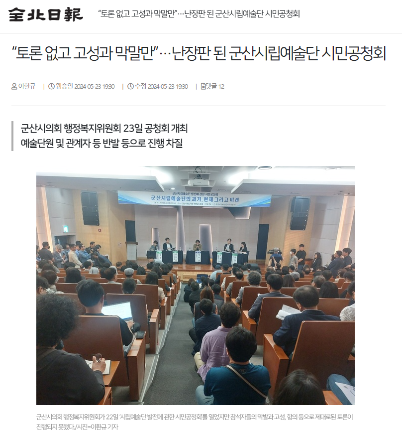 오늘 자 전북일보는 “군산시의회 행정복지위원회가 진행한 시민 공청회가 참석자들의 고함과 격한 방해로 아수라장이 됐다.”라며, “시립예술단의 발전방안 모색이라는 애초 취지에 맞지 않게 공청회가 엉뚱한 방향으로 흘러가면서 시립예술단 운영 논란은 앞으로도 지속될 것으로 전망”된다고 보도했습니다.