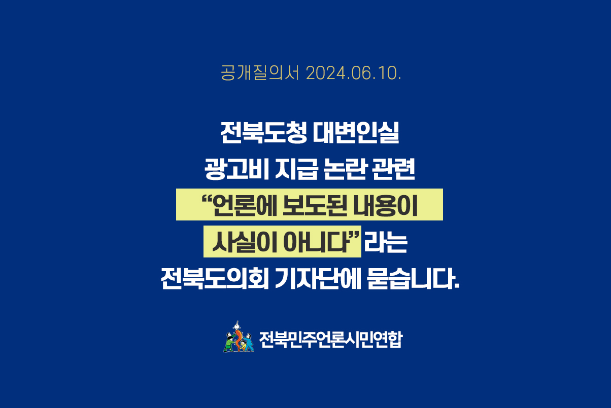 5. 다시 한번 전북도의회 기자단에 요구합니다. 광고를 받게 된 경위 및 사건을 인지하게 된 이후 기자단의 대응까지 진상 조사를 통해 진위를 소상히 파악하고 해당 내용을 지역사회에 공개해 주시기 바랍니다. 본회는 전북도의회 기자단의 입장을 기다리며 향후 이와 관련해 파악되는 내용을 모두 공개할 것임을 밝힙니다.