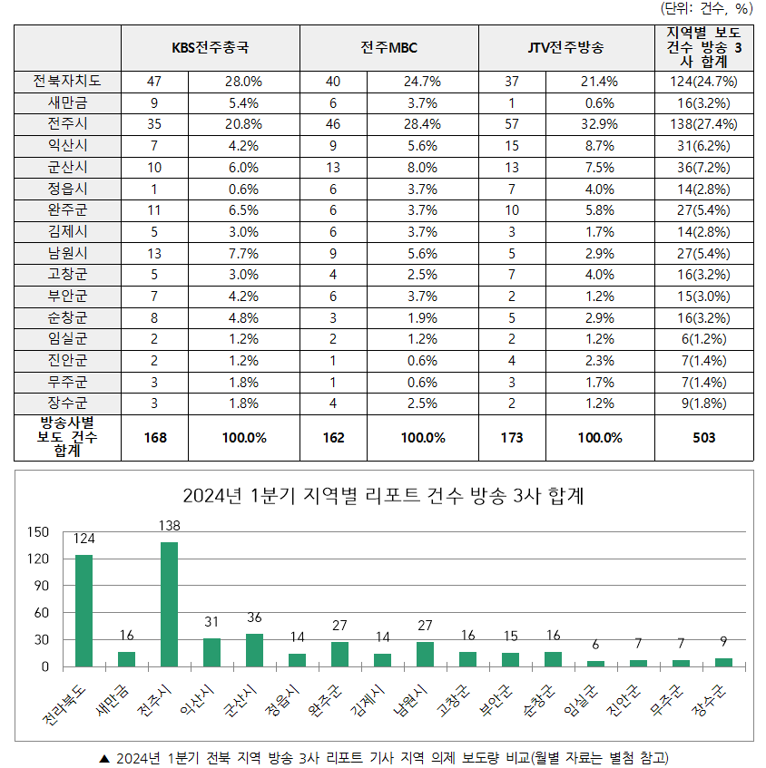 2024년 1분기(1월~3월) 동안 전북 지역 방송 3사가 보도한 지역 의제 리포트 기사 건수는 총 503건으로 나타났다. 2024년 1분기 동안 가장 많이 보도된 지역은 전주시로 총 138건 보도됐다. 반면 임실군은 총 6건으로 가장 적게 보도된 지역으로 나타났으며 전주시와 23배 차이다.