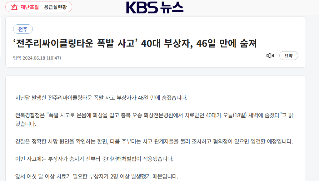 [뉴스1] 전주종합리사이클링타운 폭발사고로 중상 입은 노동자 결국 사망(6/18, 임충식)