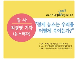 소통/공지·활동 소식 (1025) 썸네일형 리스트형 2015 전주시 마을미디어 활성화사업 신청 안내 2015 전주시 마을미디어 활성화사업 신청 안내 전주시민미디어센터에서는 전주지역 마을미디어의 활성화와 마을미디어에 대한 인식확산,마을미디어 신규단체 발굴을 위한2015 전주시 마을미디어 활성화 사업을 진행합니다. 본 사업은 전주지역을 대상 권역으로 하며마을공동체를 중심으로 하는 일정한 지역/동을 단위로 신청 대상을 받습니다. 신청대상은 지역의 비영리단체/주민모임 등이며개인활동을 목적으로 하는 대상과 내용은 신청할 수 없습니다. 본 프로그램의 신청분야는 마을신문3곳, 마을방송3곳으로미디어교육(마을신문교육, 마을방송교육)지원과 활동 지원으로 운영됩니다. 자세한 지원 사항은 본 페이지에 첨부된'2015 전주시 마을미디어 활성화사업 설명 및 안내 자료'를 참조하시면 되며자료 안의 서식에 맞춰 온라인 제출을 해주.. 미디어포럼) 경제 뉴스는 우리를 어떻게 속이는가, 강의 현장 (20150626) 경제 뉴스는 우리를 어떻게 속이는가_뉴스타파 최경영기자 최경영 기자는1995년 12월에 KBS에 입사했다. 주로 시사 보도 프로그램을 맡아왔는데, 탐사보도팀, 미디어포커스, 특별기획 한국사회를 말한다 등에서 좋은 동료들과 함께 일했다. 정권의 방송 장악 논란으로 시끄러웠던 2008년 여름에 그는 '공영방송 사수를 위한 KBS 사원행동'에 소속해 언론의 독립을 지키기 위해 치열하게 싸웠다. 덕분에 이른바 '9.17 보복인사'로 탐사보도팀에서 스포츠 중계팀으로 발령받았다. 그는 2009년 여름 이후 회사를 휴직하고 2010년 미국 미주리 대학 저널리즘 대학원에서 언론학을 공부했다. 현재 뉴스타파 기자이다. ---------------------------------------------------------.. 2015 방송캠프(미디어힐링캠프) 교육일정 및 주의사항 안내 방송캠프가 미디어힐링캠프로 이름을 변경했어요. 전보다 더 신나고 즐겁게 미디어를 배워보는 시간!어린이 여러분들의 적극적인 신청을 기다리고 있을게요.친구들과 선생님들과 재미있게 미디어를 배워봐요 대 상 전북지역 초등학교 3~6학년 재학생 40명기 간 7.29(수) ~ 7.31(금) / 2박 3일장 소 임실군 박사골체험관참 가 비 10만원 / 전북민언련 후원회원 8만원신청기간 6.15 ~ 마감까지접 수 아래 첨부된 신청양식 다운 후 메일로 보내주세요. malhara21@hanmail.net (전북민언련) 아래 신청서 다운받기 7월 29일 수요일시간프로그램세부내용09:30집결전주 시청 앞 민원실 집결10:00출발버스로 단체출발11:30도착/마음열기■ 이름표 놀이와 인디언식 이름 짓기12:30점심식사식당13:3.. 2015 방송캠프(미디어힐링캠프) 공지 대 상 전북지역 초등학교 3~6학년 재학생 40명 기 간 7.29(수) ~ 7.31(금) / 2박 3일 장 소 임실군 박사골체험관 참 가 비 10만원 / 전북민언련 후원회원 8만원 신청기간 6.15 ~ 마감까지 접 수 아래 첨부된 신청양식 다운 후 메일로 보내주세요. malhara21@hanmail.net (전북민언련) -------------------------------------------------------------------------- 문 의 063-285-8572 (담당자 김민지 간사) 후 원 전라북도교육청 주 최 전주시민미디어센터 영시미 주 관 전북민주언론시민연합, 익산공공영상미디어센터 재미 더 자세한 교육일정은 아래 링크로 들어가주세요 > http://www.malhara.or.kr.. 미디어포럼 6월 특강 안내) 경제 뉴스는 어떻게 우리를 속이는가_ 최경영 뉴스타파 기자 "경제 뉴스는 우리를 어떻게 속이는가?" 지역에서는 지역의 이익으로 포장 된 기득권 이익지키기가 계속 이어지고 있다. 대표적인 사례로 ‘새만금'을 들 수 있다. 최근에는 새만금 내 카지노 유치를 지역발전으로 포장해 발생할 문제는 침묵하고 개발 이익을 우선하는 지역신문의 보도가 이어지기도 했다. 이처럼 지역의 발전이라는 거대 명분 속에 개인의 이익과 생존권 보장의 문제는 철저히 무시되어 왔다. 하지만 지역 언론은 허구 속에 감춰진 개별적 이익에 대해서 침묵하는 사례들이 많았다. 지역언론에서 빈번하게 벌어지는 구조적 병폐들을 어떻게 분석하고 고쳐나가야 할까? 미디어포럼에서 준비한 "경제 뉴스는 우리를 어떻게 속이는가" 특강은 뉴스타파 최경영 기자와 함께하며 그 해답을 논의하는 시간이 될 것이다. 최경영 기자.. 2015 봄 체육대회 후기 "신나게 웃고 맘껏 즐기자"민언련 체육대회가 25일 선화학교에서 있었습니다. 35명 정도의 회원이 참가해주셨어요. 가족들과 다같이 오시는 회원님들도 계셔서 더욱 화기애애 했어요. 참여해주신 회원님들 감사해요. 사실 더 많은 분들이 오시리라 기대했건말..생각보다 많은 분들이 참석하지 못해서 아쉬웠어요. 분명히 오신다고 하셨는데 (!!!!!) 덕분에 저희는 남은 음식과 경품을들 풍성히 나눠가지긴 했습니다. 하하. 경기 결과는 9:0으로 청팀의 압승 ! 패자에게는 보이는 것처럼 커피와 분간이 안되는 간장을 마시게 되는 벌칙이 기다리고 있습니다. 특히 유이사님 죄송해요. 아마 오늘 물을 엄청 많이 마셨을거에요. 처음엔 농구로 시작했어요. 누군가는 부상까지 당하며 열정적으로 경기에 임해주셨어요. 산악회 이후로 몸.. 전북민주언론시민연합 사무실 이전 전북민주언론시민연합이 4월 28일 중앙동