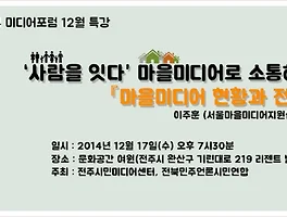 소통/공지·활동 소식 (1025) 썸네일형 리스트형 미디어포럼 12월-2차 공지) '사람을 잇다' 마을미디어로 소통하자 미디어포럼 12월-2차 공지) '사람을 잇다' 마을미디어로 소통하자 이주훈 서울마을미디어지원센터장과 함께 마을미디어의 현황과 전망에 대해 점검합니다. '사람을 잇다' 마을미디어로 소통하자라는 주제로 진행되는 이번 포럼에서는 전주지역에 있는 마을신문 관계자들과 함께 모여 전주지역의 마을미디어 현황을 짚어봅니다. ○ 일시 : 2014년 12월 17일 (수) 오후 7시 30분 ○ 장소 : 문화공간 여원 (전주시 완산구 기린대로 219 리젠트 빌딩 1층) ○ 주최 : 전북민주언론시민연합, 전주시민미디어센터 2014 12월 미디어포럼 현장 "진짜 뉴스 뉴미디어로 날개 달다" 박대용 뉴스타파기자 뉴스타파가 뉴미디어를 어떻게 활용하고 있는지 그 방법과 매체를 알아보았어요. 쉽게 접근할 수 있지만 전혀 몰랐던 툴들이 많았습니다. 페이스북만큼은 더 알게 없다고 생각했는데 말이에요 허허. 게다가 전주지역민들이 뉴스타파를 얼마나 보고 있는지도 다 알고 계시더라구요. 전주 꽤 높았어요 ! 그래서 인지 이번 포럼에는 기존 민언련 회원이 아닌 분들도 많이 볼 수 있었네요. 얼마전 언론학교와 마을신문교육에서 봤던 분들도 만날 수 있었습니다. 꾸준히 언론에 관심을 민언련을 통해 많이 배우고 나눴으면 해요 ^^ ▲ 카페에서 진행된 포럼 ▲정성스럽게 준비한 다과 ▶ 현장 동영상 미디어포럼 12월 공지) 뉴스타파 박대용 기자와 함께하는 "진짜 뉴스, 뉴미디어로 날개달다" 뉴스타파 박대용 기자와 함께 "진짜 뉴스, 뉴미디어로 날개달다" 주제로 이야기 합니다^^ 박대용 기자는 SNS와 정보공개청구 전문가로 뉴스타파의 탐사보도에 힘을 불어넣고 있습니다. 기자는 2001년 MBC에 입사해 이달의 기자상, 프로그램 제작상 등을 수상했으며 타 언론사 기자들을 상대로 2009년부터 정보공개청구 및 SNS 활용 취재기법을 강의했으며 2014년 뉴스타파에 합류했습니다. 많은 관심 부탁드립니다. 누구나 수강 가능합니다! 일시 : 2014년 12월 11일(목), 오후 7시 30분 주최 : 전북민언련, 전주시민미디어센터 장소 : 문화공간 여원 (대우빌딩 옆, 전주시 완산구 기린대로 219 리젠트 빌딩 1층) 네이버지도) http://map.naver.com/?dlevel=12&pinType=.. 21기 시민언론학교] 6강 김현정PD 많은 분들이 기다리던 5강 김현정 PD 라는 주제로 강의가 시작했어요^^ 라디오에서 나오던 목소리와 너무 똑같아서 다들 놀라신 분들이 많더라구요. 김현정앵커는 사건의 당사자의 이야기를 듣는 것이 중요하다고 누누이 강조했어요. 사건과 관련된 다양한 전문가들의 의견보다 당사자의 입장을 들어보는 것이 그 사건에 대해 정확히 말해주고, 청취자들도 가장 궁금해 할거라고. 아마 그 힘이 청취자들에게 전해졌기에 이렇게 많은 사랑을 받지 않았나 싶어요. 당사자가 말하고 싶을 때는 기다려주고, 방송 이후에도 지속적으로 그 사건과 당사자에 관심을 가지고 있던 자세를 배우고 싶어요. 꼭 인터뷰가 아니더라도 말이죠. "당신이 그 사건에 대해 정확히 모르는 건 너무 멀리서 보고 들었기 때문이다" 궁금한 점은 모두 물어보는 시간.. 신문만들기 공모전! 시민과 함께 하는 신문만들기 공모전 !!! 신문만들기 공모전! 시민과 함께 하는 신문만들기 공모전 !!! 전주시민미디어센터에서 2013년에 이어 2014년에도 시민과 함께 하는 신문만들기 공모전을 진행합니다. ... 아동청소년 부문과 일반 부문으로 나뉘어 진행되는 본 공모전은 출품 내용에 대한 제한은 없으며 신문의 형식을 따라 제작하는 신문 만들기 공모전입니다. 접수마감은 2014년 11월22일까지입니다. ☐ 응모기간 : 2014년 11월22일 토요일까지 ☐ 참여대상 : 대한민국 국민 누구나 ☐ 주 관 : 전주시민미디어센터 영시미, 전국미디어센터협의회 ☐ 후 원 : 한국언론진흥재단 ☐ 공모형식 및 방법 ○ 공모내용 - 신문만들기 ○ 공모분야 - 아동청소년 부문, 일반 부문 (총 2개 부문) - 작품 제출시 상기 2개 부문 중 부문 명시 ○ 신문 .. 21기 언론학교] 1,2강 강의 장면 스케치:) 시작됐다~ 21기 언론학교!! 언론학교를 열어주신강준만 교수님 정말 다들 진지하죠?^^ 올해 제작 된 언론학교 자료집!저자들의 저서도 할인 판매 하고 있습니다^^ 수강 신청 인원이 180명이 넘습니다. 출석부만 한가득~ 장하성 교수님과 함께~ 정의로운 경제를 만들기 위한 고민, 많은 분들이 자리를 지켰습니다. -언론학교 2강 한국 자본주의! 많은 분들이 저자 서명을 받기 위해 줄을 서고 계시는~ 두 거장의 대화가 오고 가는 속에 즐거운 뒷풀이가 이어졌습니다.전북대 오스스퀘어에서- 2014 마을신문교육 신청하세요^^ 신청은 전화와 이메일 접수 가능합니다. 전화 : 063-285-8572 이메일 : malhara21@hanmail.net 이메일 접수시에는 (이름, 연락처, 이메일, 교육을 알게 된 경로)를 꼭 적어주세요^^ 이메일 제목에는 "마을신문교육프로그램 신청합니다"로 적어주세요~ 언론학교 밴드 오픈:) 언론학교와 관련된 활동을 위해 밴드를 만들었습니다. 21기 언론학교 입니다. 초대를 원하시는 분들은 메시지를 남겨주세요 언론학교와 관련된 공지, 수강 사진, 그리고 질문등