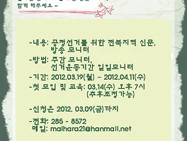 소통/공지·활동 소식 (1025) 썸네일형 리스트형 공정방송 회복을 위한 도민문화제 '마봉춘, 볼 날은 온다!' 공정방송 회복을 위한 도민문화제 '마봉춘, 볼 날은 온다!' [공동행동 보도자료] 19대 총선 여야 후보자 공개질의서 결과 발표(2012.4.9) 야당후보, ‘공정보도 보장’·‘언론장악 진상규명’ 약속 - 일부 새누리당 후보, ‘MB의 언론장악과 언론자유 훼손’에 동의 -. ‘MB언론장악 심판·MB 낙하산 퇴출, 공정보도 쟁취를 위한 공동행동’(이하 공정언론 공동행동)은 지난 3월 13일 370여개 시민사회·정당·네티즌단체가 언론사 노조와 함께 ‘낙하산 사장 퇴출’, ‘공정보도 쟁취’에 힘을 모으고, 이명박 정권의 언론장악을 심판하기 위해 발족한 범국민 연대기구입니다. -. MBC·KBS·YTN·연합뉴스 등 공정보도 쟁취를 위한 언론사 노조들의 총파업 투쟁이 장기화되고 있습니다. 또한 부산일보는 ‘정수장학회 환수, 편집권 독립’, 국민일보는 ‘조용기 목사 일가 신문 사유화 반대’를 요구하며 파업을 벌이고 있습니다. 더욱이 최근에는 민간인 불법사찰,.. [보도자료] 19대 총선 ‘지역미디어공공성 의제에 대한 공개질의서’ 답변 결과 수 신 각 언론사 사회부/시민사회단체 발 신 지역미디어공공성위원회 (담당 : 김환표 전북민언련 사무국장 063-285-8572 Fax : 063-285-8527) 제 목 19대 총선 ‘지역미디어공공성 의제에 대한 공개질의서’ 답변 결과 날 짜 2012년 4월 5일(수) 1. 귀 사의 무궁한 발전을 기원합니다. 2. 지역미디어공공성위원회는 지역정보의 유통공간이자 공론장으로서의 지역언론의 발전과 정상화를 위해 활동하는 지역언론학회, 지역언론노조, 지역PD연합회, 지역시민사회단체 등이 참여하는 연대기구입니다. 3. 지역미디어공공성위원회는 4․11 총선을 유권자의제를 중심으로 한 정책선거로 이끌고 지역 풀뿌리민주주의의 핵심 과제 가운데 하나인 지역언론 활성화 정책을 제시하기 위해 관련단체와의 간담회 등을 통해 .. 파업중인 언론사 노조를 응원합니다! MBC,KBS,YTN,연합뉴스와 국민일보, 부산일보 등 언론사들의 공영성과 편집 편성권을 회복하고 지켜내기 위한 파업의 열기가 뜨겁습니다. 지역 MBC 노조 역시 지난 12일 김재철 사장 퇴진과 공정보도를 촉구하며 연대파업에 동참했습니다. KBS 새노조는 김인규 사장 퇴진과 공정보도를 위한 총파업의 뜻을 알리기 위해 국토대장정에 나섰는데요. 어제인 20일 오후 전남 해남에서 출발한 국토대장정 단원들이 전주에 들어왔습니다. KBS 새노조는 전주MBC 노조와 결합하여 전주 시내를 다니면서 시민들에게 파업의 의미를 알렸습니다. 전북민언련과 전북환경운동연합, 전북여성단체연합, 참여자치전북시민연대에서 이들을 응원키 위해 자리를 함께 했습니다. 으랏차차~ 화이팅!! 2012 총선 모니터단 모집~ 2011년 정기총회에 함께해주신 회원님들께 감사드립니다~ 지난 금요일(27일) 전북민언련 정기총회에 함께해주신 회원님들께 감사드립니다!! 사진자료실에 더 많은 사진이...!! 22011 정기총회에 참석해주신 회원님들 감사합니다.. 지난 27일 전북민언련 '2011 정기총회'가 있었습니다. 바쁘신 가운데 함께해주신 회원님들께 감사드립니다. 2012년에도 '언론개혁은 시민의 힘으로'라는 기치를 잘 실천해나갈 수 있도록 최선을 다하겠습니다. 정기총회를 진행 중이신 장낙인 공동대표님.. 정기총회 사회를 맡은 김환표 사무국장.. 새 공동대표를 맡아 주신 김병직 대표님.. 2011년 '올해의 회원상'을 수상한 김재호 회원님.. 정기총회를 마치고.. 정기총회 후 함께해주신 회원님들과 저녁식사도 함께 했습니다~ 건배사 중이신 권혁남 공동대표님.. 전북민언련 정기총회 안내 이전 1 ··· 67 68 69 70 71 72 73 ··· 129 다음