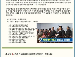 자료/이달의좋은기사·전북민주언론상 (267) 썸네일형 리스트형 3월의 좋은 기사 선정:) 군산 전북대병원 부지선정 문제제기 3월의 좋은 기사군산 전북대병원 부지선정 문제제기 ○ 작성 기자 : 전주MBC 고차원, 정진오 기자○ 보도된 기사 : 1/28고차원매입비는 21억, 기반시설비는 260억 고차원환경단체 “군산전북대병원 예정지 변경해야”1/29고차원병원 앞 요지 특혜의혹2/9고차원환경단체, 군산전북대병원 예정지 변경 촉구2/12고차원5번째 깊은 고민...어떤 결정?3/11정진오입지선정과정 ‘논란’3/19정진오시민 동원해서 여론몰이 했나 고차원문시장, 시민 모아놓고 버젓이 거짓말 ○ 선정 이유 : 군산 전북대 병원이 들어설 백석제 부지를 놓고 전북지역 환경운동 단체들은 백석제가 생태적 중요성이 매우 높으며, 군산시가 태환경도시가 되기 위해서도 보존은 필요하다고 주장하며 지역사회에 논란이 일었다.이런 생태적 중요성 외에도 부지.. 2015년 3월의 좋은 기사를 뽑아주세요 :) 왜 후보에 올랐는지 알려드립니다. 구체적 추천사유를 꼼꼼하게 읽어보세요 :) 후보작 1. 정상화 걸림돌..비리 재단 복귀_KBS전주총국 ○ 작성 기자 : 한주연 기자 ○ 추천 사유 : 서남대 인수를 놓고 경쟁이 뜨거웠다. 서남대 의대 몫을 가져가려는 타지역의 관심이 불거지면서 지역의대 몫을 지켜야 한다는 여론이 급등하며 홍역을 앓은 가운데 최종적으로 명지병원이 우선협상대상자로 선정되었다. 하지만 이후 대학을 벼랑 끝으로 몰아넣었던 서남대 설립자 이홍하씨가 (구재단측) 인수절차금지가처분 신청을 함으로써 논란 속에 다시 서게 되었다. 대학운영권을 놓지 않으려는 비리사학재단의 방해가 점입가경인 가운데 KBS전주총국 한주연 기자는 “법을 앞세워 대학에 속속 복귀해 정상화를 가로막는 비리 사학들”의 문제를 제기하.. 2월의 좋은기사 선정:) [전주·완주 시내버스 요금 단일화 첫날] 비현실적 무료환승 답답_ 전북일보 최명국 기자 2월의 좋은기사 :) [전주·완주 시내버스 요금 단일화 첫날] 비현실적 무료환승 답답 ○ 작성 기자 : 전북일보 최명국 기자 ○ 보도 기사 : 2015년 2월 2일 1면 3단 머리기사 ○ 선정 이유 : 전주 완주 시내버스 요금 단일화 첫 날 기자가 직접 시내버스 무료환승 실태를 체험한 기사이다. 버스 배차간격이 40분이 넘는데 30분 내 갈아타야 하는 문제와 교통카드 있어야만 혜택을 볼 수 있는 시스템을 문제로 지적했다. 또한 기사들이 제복이 얇아 안 입게 되는 상황을 보도하며 좋은 취지의 제도지만 준비가 미비하면 현장에서 제대로 적용되지 못함을 보여줬다. ○ 모니터 대상 : 새전북신문, 전북도민일보, 전라일보, 전북일보 전주MBC, 전주KBS, JTV 전주방송, 전북CBS ○ 투표 기간 : 3월 11일.. 2015년 2월의 좋은 기사를 뽑아주세요 :) [별첨자료] ○ 전북일보 기사 전문 (후보작1) 비현실적 무료환승 답답 1일부터 전주와 완주를 오가는 시내버스 요금이 거리와 상관없이 1200원으로 동일하게 적용된다. 전주시는 단일요금제 시행과 함께 모든 운전원이 제복을 착용한다고 밝혔다. 전주시와 완주군에 따르면 그동안 전주까지 7100원의 버스요금을 내온 완주군 운주면 대둔산 주변과 고당리 피묵마을 주민들은 이달부터 1200원으로 전주에 나올 수 있게 됐다. 하지만 실제 현장은 상황이 좀 달랐다. 전북일보 취재진은 1일, 전주에서 시내버스로 완주군 운주면까지 이동해보기로 했다. 우선 전주에서 535번 시내버스를 타고 종점인 완주 고산터미널에서 내렸다. 요금은 1200원이었다. 지난달까지만 해도 전주에서 고산까지의 버스요금은 3000원이었다. 주민 박.. 1월의 좋은기사 선정:) 무늬만 공채, 측근 인사 지원 빌미 주는 자격 요건 보도 1월의 좋은기사 선정:) 무늬만 공채, 측근 인사 지원 빌미 주는 자격 요건 ○ 작성 기자 : 전주MBC 이경희, 김아연 기자 ○ 보도된 기사 : 1월 6일/ 무늬만 공채..측근 인사 1월 6일/ 측근 인사 지원 빌미 주는 자격요건 ○ 선정 이유 : 각종 선거가 끝나면 당선자 측근이나 선거 캠프 사람의 낙하산 인사가 문제가 되곤 한다. 전라북도에서는 보은인사를 막겠다며 주요 기관 3곳에서 공모를 실시했었다. 이에 전주MBC에서는 과거 보도되었던 내용 중 일부를 되짚어보며 주요 기관 3곳에서 진행된 공모가 말만 공개경쟁이지 실상은 측근 인사 채용으로 진행되었음을 밝혔다. 또한 연속된 보도에서 공채시스템의 허술한 자격 요건이 전문성이 요구되는 자리들마저 측근인사로 채울 수 있는 빌미를 제공하고 있다고 지적했.. 2015년 1월의 좋은 기사를 뽑아주세요 :) 왜 후보에 올랐는지 알려드립니다. 구체적 추천사유를 꼼꼼하게 읽어보세요 :) 후보작 1. 가짜 친환경 하림그룹, 본사는 모르쇠? _ 전주MBC 국내 최대 닭고기 기업인 하림그룹 계열사가 일반 닭고기를 친환경이라고 속여 50억 원 넘게 판매하다 적발됐다. 학교 급식자재 납품 물건을 주로 속였는데 유치원까지 짝퉁 물품을 납품한 것으로 드러나 지역사회에 충격을 줬다. 전주MBC는 해당 업체가 하림그룹이 지분의 81%를 가진 주력 자회사인 ‘그린바이텍’으로 하림 본사와 불과 500미터 거리에 있음을 구체적으로 밝혔다. 또한 본사
