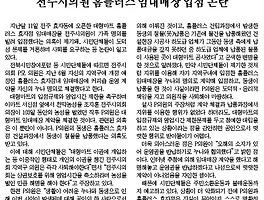 전체보기 (5121) 썸네일형 리스트형 추석 귀향 선전전 추석 맞이 귀향 선전전 일시 : 9월 9일(금) 오후 2시 장소 : 전주 이마트 앞, 전북대 구정문 앞 * 참여 가능하신 분들은 이마트와 전북대로 오세요~ 전북일보, 익산시의 도로공사 입찰방식 변경…“입찰의 공정성” 확보해야(2011/9/8) 전북일보, 익산시의 도로공사 입찰방식 변경…“입찰의 공정성” 확보해야 오늘의 브리핑 1) 전북일보, 익산시의 도로공사 입찰방식 변경…“입찰의 공정성” 확보해야 2) 전주시의원의 도덕적 해이…전주KBS 모르쇠로 일관 1) 전북일보, 익산시의 도로공사 입찰방식 변경…“입찰의 공정성” 확보해야 전북일보는 9월 7일자 1면 에서 익산시가 익산일반산업단지 진입도로 개설공사 발주 과정에서 입찰공고를 내기 직전에, 입찰방법을 대안 입찰에서 최저가 입찰로 변경하려고 해 상당한 논란이 예상된다고 했다. 이 기사는 높은 기술성을 요구하는 대규모사업을 대안입찰이나 일괄입찰(턴키방식)이 아니라, 최저가 입찰로 추진하려는 것은 매우 이례적인 일이라면서 입찰방식 변경은 입찰방법이 공고된 지 무려 8개월이 지난 시점에서 추진된다는.. 전주MBC, 전주시의회의 제식구 감싸기… JTV전주방송, 전주시의원의 대리운전 영업 비판해(2011/9/7) ■ 전주MBC, 전주시의회의 제식구 감싸기… JTV전주방송, 전주시의원의 대리운전 영업 비판해 오늘의 브리핑 1) 전주MBC, 전주시의회의 제식구 감싸기… JTV전주방송, 전주시의원의 대리운전 영업 비판해 2) 전주MBC, 전라북도의 프로야구 제10구단 유치 논란과 걸림돌 짚어 1) 전주MBC, 전주시의회의 제식구 감싸기… JTV전주방송, 전주시의원의 대리운전 영업 비판해 전주MBC는 어제 저녁뉴스에서도 홈플러스로부터 특혜의혹을 받고 있는 전주시의원 관련 기사를 내보냈다. 전주MBC는 에서 대형 마트 규제를 외치던 전주시 의원이 뒤로는 개인적인 이권을 챙겨온데 대해 비난이 뜨겁다면서 “대형마트 규제를 치적으로 내세우는 시의장은 의원 개인의 일일 뿐이라며 제 식구 감싸기에 급급한 모습”이다고 꼬집었다. 시.. 홈플러스의 전주시의원 특혜 의혹, 지역언론 침묵하거나 소극적으로 보도해(2011/09/06) ■ 홈플러스의 전주시의원 특혜 의혹, 지역언론 침묵하거나 소극적으로 보도해 오늘의 브리핑 1) 홈플러스의 전주시의원 특혜 의혹, 지역언론 침묵하거나 소극적으로 보도해 1) 홈플러스의 전주시의원 특혜 의혹, 지역언론 침묵하거나 소극적으로 보도해 홈플러스의 전주시의원 특혜 의혹에 대한 시민단체의 문제제기가 계속 이뤄지고 있다. 전북시민참여포럼은 9월 5일 성명에서 “지역주민의 바람을 정책 결정에 반영해야 할 시의원이 오히려 대형마트의 입장을 옹호하고 뒤로는 이익을 챙기는 비윤리적인 행위를 하고 있다”며 사퇴를 촉구했다. 이에 특혜의혹을 받고 있는 의원은 “모든 것은 내 불찰이며 책임을 지고 누나와 상의해 커피숍 매장을 정리하겠다”고 밝혔다. 전주MBC만 연일 의혹을 제기하고 있을 뿐 전주KBS는 여전히 이와.. 전주MBC…홈플러스의 전주시의원 특혜 의혹 연일 지적해 (2011/09/05) ■ 전주MBC…홈플러스의 전주시의원 특혜 의혹 연일 지적해 오늘의 브리핑 1) 전주MBC…홈플러스의 전주시의원 특혜 의혹 연일 지적해 1) 전주MBC…홈플러스의 전주시의원 특혜 의혹 연일 지적해 8월 중순 전주시 효자동에 문을 연 홈플러스의 식음료 매장에 전주시의회 한 의원이 고가의 커피숍을 임대한 것으로 밝혀져 논란이 일고 있다. 전주MBC는 9월 1일자 저녁뉴스 에서 대형마트 입점을 반대했던 전주시 의원이 뒤로는 알짜배기 임대 매장을 챙긴 것으로 드러났다며 의회의 반발을 무마하기 위해 대형마트가 로비를 한 것 아니냐는 의혹마저 제기되고 있다고 지적했다. 문제의 커피숍은 전주시의원의 누나의 명의로 되어 있지만 전주시의원과 무관하지 않다고 것이다. 이어 이 기사는 “전주시의회는 지난 해 12월부터 올 4.. 현대차와 비정규직 노동자 충돌, 지역언론 침묵해 (2011/9/2) ■ 현대차와 비정규직 노동자 충돌, 지역언론 침묵해 오늘의 브리핑 1) 현대차와 비정규직 노동자 충돌, 지역언론 침묵해 2) 전라북도의 무상급식…방송사간 시각 차이 1) 현대차와 비정규직 노동자 충돌, 지역언론 침묵해 8월 31일 오전, 공장안으로 들어가려던 현대자동차 비정규직 전주지회 노동자들과 이를 막아서려는 현대차 관리자와 하청업체 사이에 충돌이 발생해 현대차 비정규직 조합원 5명이 심하게 다치는 일이 발생했다. 이번 충돌은 2년 이상 현대자동차 사내협력업체에서 근무한 노동자는 정규직 고용으로 간주해야 한다고 판결한 대법원의 판결을 현대자동차가 지키지 않으면서 발생한 사건이라고 볼 수 있다. 2010년 7월 22일 대법원은 2년 이상 현대자동차 사내협력업체에서 근무한 노동자는 정규직 고용으로 간주해.. 지역언론은 야구장 건립비용 문제 따져야 (2011/08/30) ■ 지역언론은 야구장 건립비용 문제 따져야 오늘의 브리핑 1) 지역언론은 야구장 건립비용 문제 따져야 1) 지역언론은 야구장 건립비용 문제 따져야 8월 29일 전라북도가 전주시·군산시·익산시·완주군과 함께 한국야구위