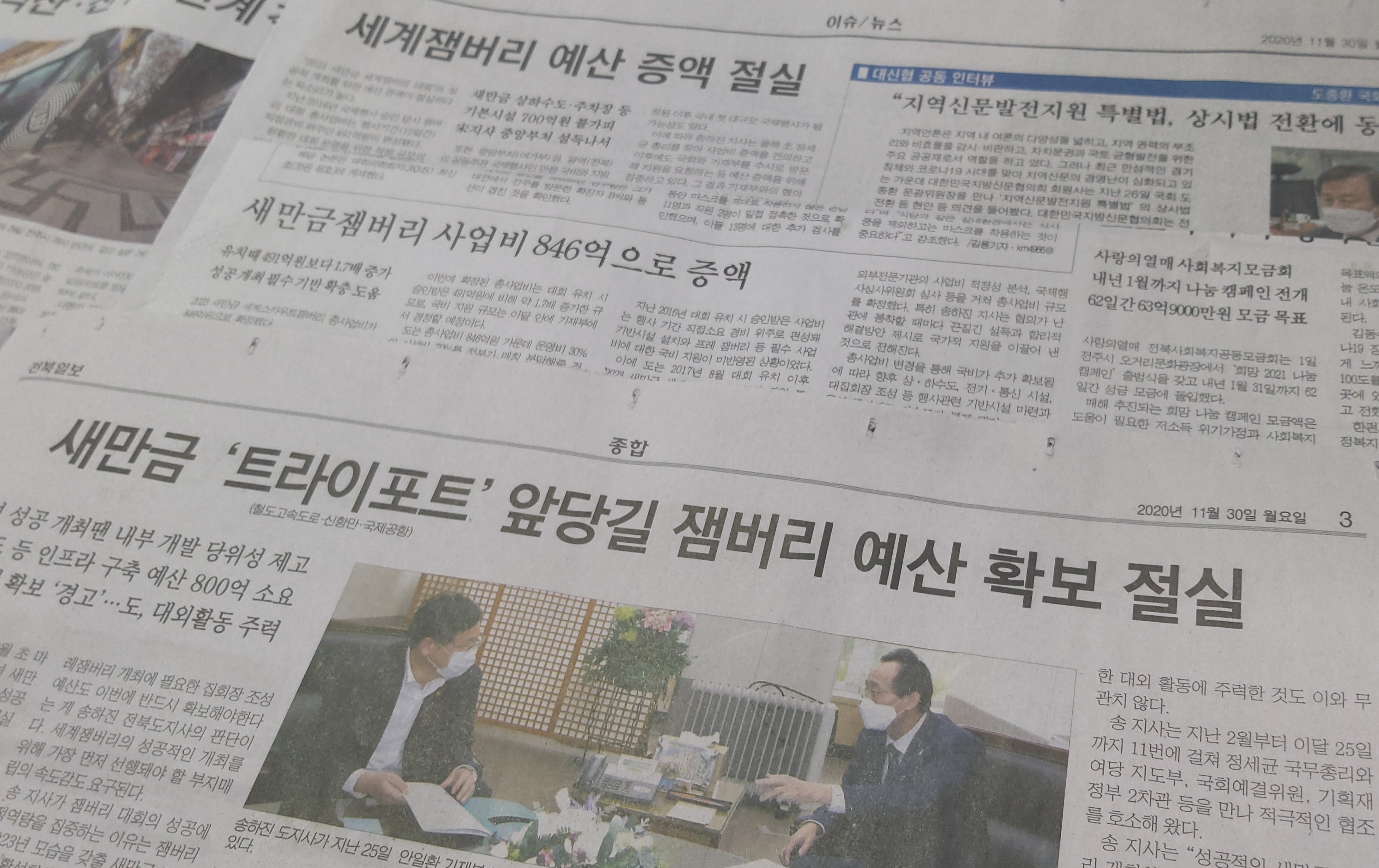 오늘 자 전북도민일보는 “전체 사업비의 11.1%에 불과한 국비 지원 비율 역시 조만간 기재부에서 재조정할 것으로 알려졌다”라고 보도했는데요, 전라일보는 “전라북도는 운영비 비율 국비 30%, 도비 70%, 시설비는 국비 70%, 도비 30% 분담을 요구한 것으로 전해진다.”라고 거론했을 뿐 자세한 도비 비중을 확인해서 전달하지는 않고 있습니다. 다른 일간지, 방송도 마찬가지입니다. 대신 보도자료에서 언급된 “송 지사, 고비마다 끈질긴 설득과 합리적 해결책 제시로 성과 일궈” 내용은 신문마다 빠지지 않고 등장합니다. 업적 칭찬보다는 도민의 세금이 얼마나 더 투입되어야 하는지, 일회성 행사에 과도한 도비가 책정되는 건 아닌지, 의회에서 챙겨야 할 사안은 없는지를 언론에서 분석해야 하지 않을까요?